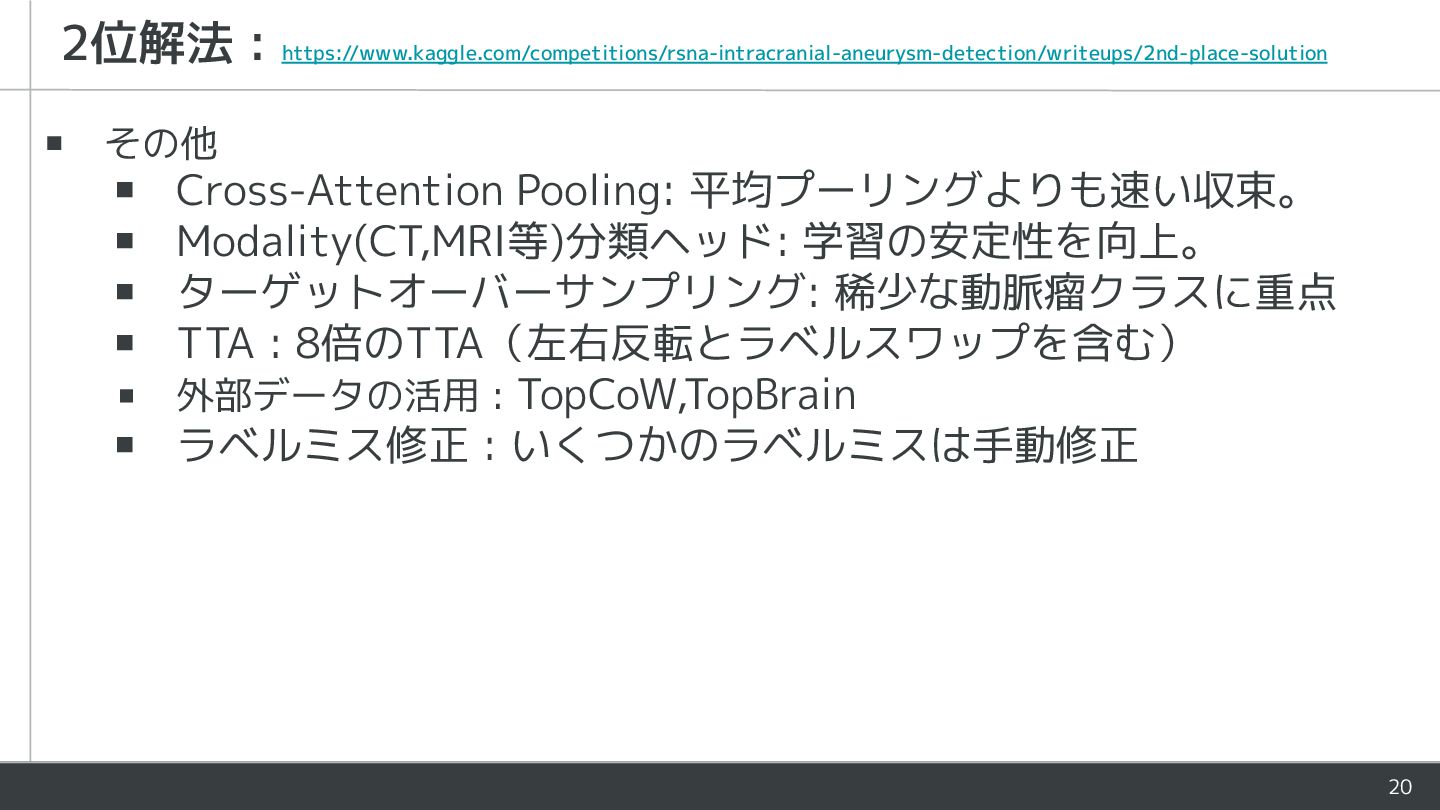 ▪ ターゲットオーバーサンプリング: 稀少な動脈瘤クラスに重点 ▪ TTA : 8倍のTTA(左右反転とラベルスワップを含む) ▪ 外部データの活用 : TopCoW,TopBrain ▪ ラベルミス修正 : いくつかのラベルミスは手動修正 2位解法 : https://www.kaggle.com/competitions/rsna-intracranial-aneurysm-detection/writeups/2nd-place-solution