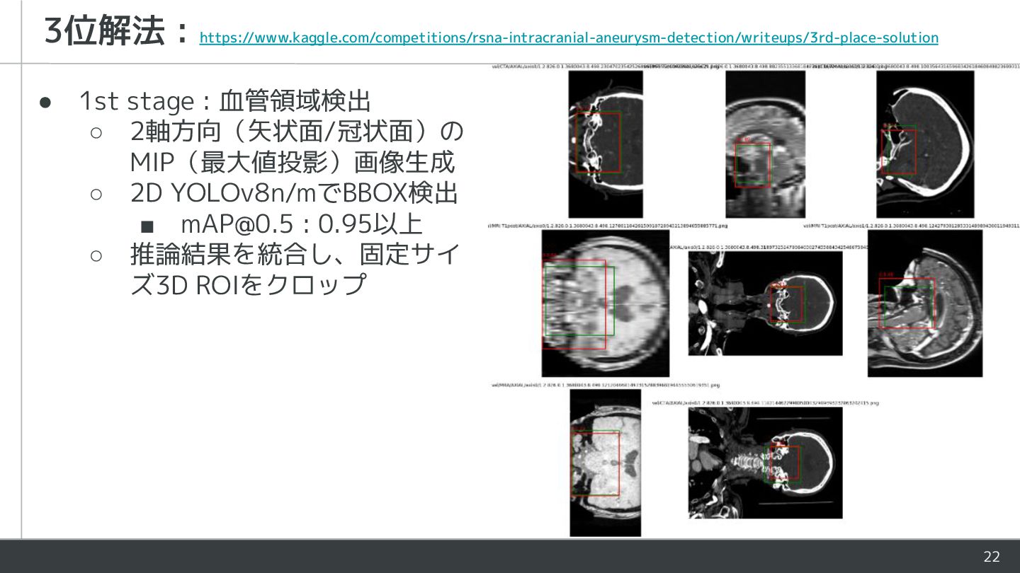 YOLOで血管領域抽出 • 2nd stage ◦ 3DCNNで分類 3位解法 : https://www.kaggle.com/competitions/rsna-intracranial-aneurysm-detection/writeups/3rd-place-solution