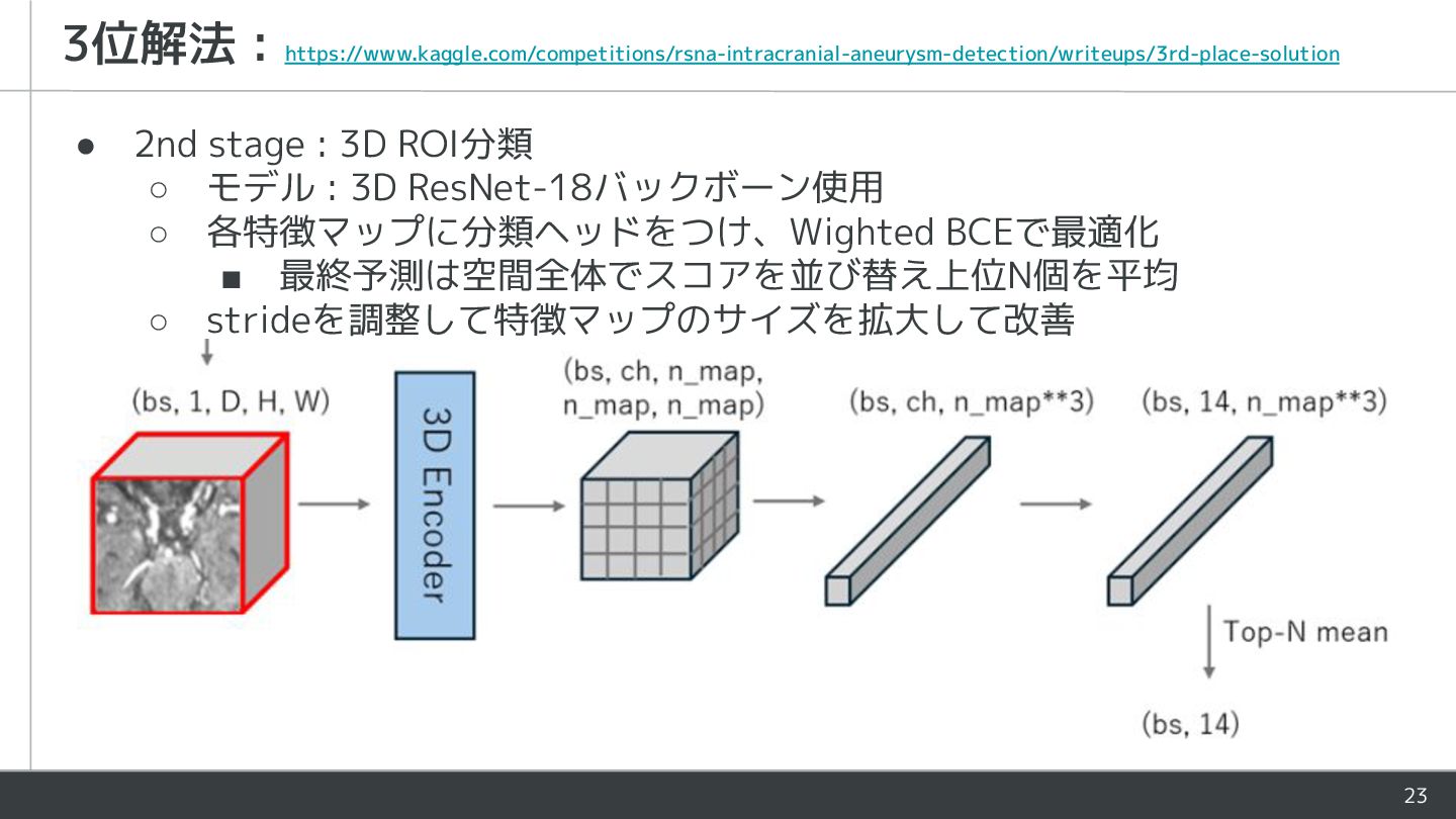 3D ResNet-18バックボーン使用 ◦ 各特徴マップに分類ヘッドをつけ、Wighted BCEで最適化 ▪ 最終予測は空間全体でスコアを並び替え上位N個を平均 ◦ strideを調整して特徴マップのサイズを拡大して改善 3位解法 : https://www.kaggle.com/competitions/rsna-intracranial-aneurysm-detection/writeups/3rd-place-solution