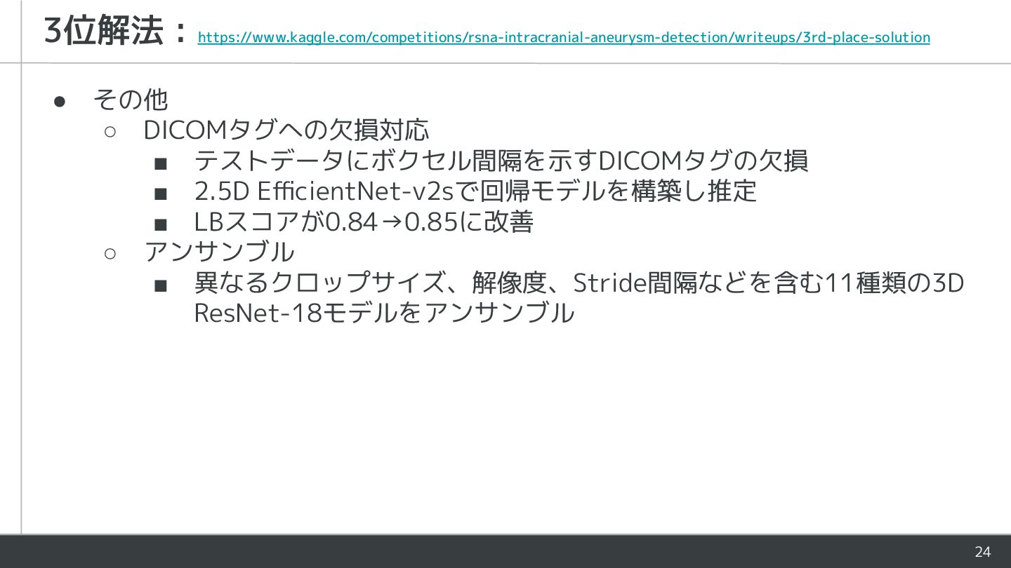 ▪ LBスコアが0.84→0.85に改善 ◦ アンサンブル ▪ 異なるクロップサイズ、解像度、Stride間隔などを含む11種類の3D ResNet-18モデルをアンサンブル 3位解法 : https://www.kaggle.com/competitions/rsna-intracranial-aneurysm-detection/writeups/3rd-place-solution