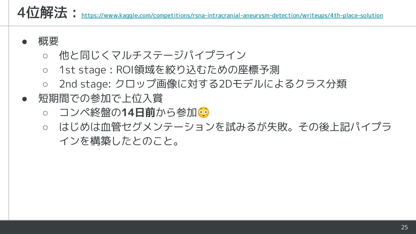 ◦ 2nd stage: クロップ画像に対する2Dモデルによるクラス分類 • 短期間での参加で上位入賞 ◦ コンペ終盤の14日前から参加😳 ◦ はじめは血管セグメンテーションを試みるが失敗。その後上記パイプラ インを構築したとのこと。 4位解法 : https://www.kaggle.com/competitions/rsna-intracranial-aneurysm-detection/writeups/4th-place-solution