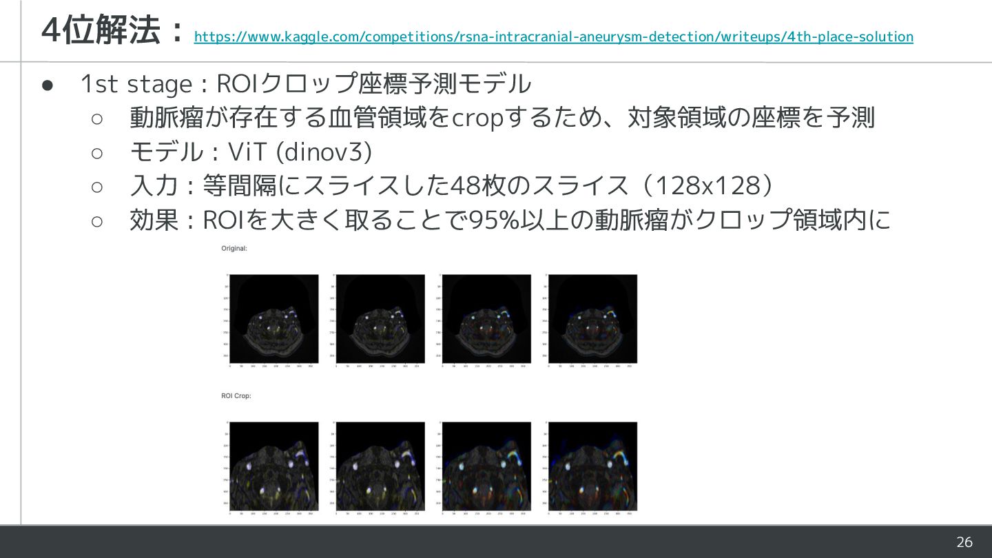 : ViT (dinov3) ◦ 入力 : 等間隔にスライスした48枚のスライス(128x128) ◦ 効果 : ROIを大きく取ることで95%以上の動脈瘤がクロップ領域内に 4位解法 : https://www.kaggle.com/competitions/rsna-intracranial-aneurysm-detection/writeups/4th-place-solution