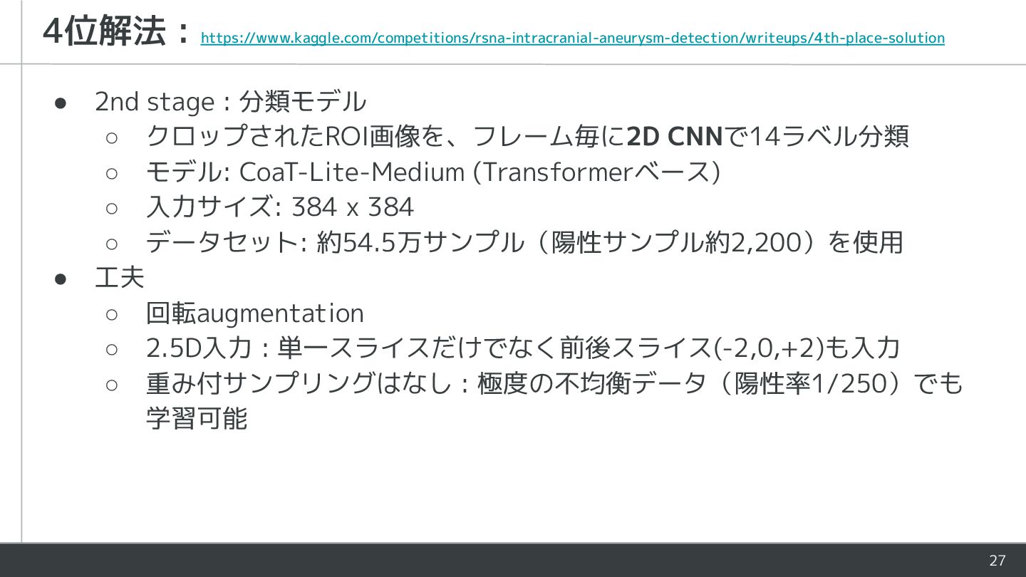 モデル: CoaT-Lite-Medium (Transformerベース) ◦ 入力サイズ: 384 x 384 ◦ データセット: 約54.5万サンプル(陽性サンプル約2,200)を使用 • 工夫 ◦ 回転augmentation ◦ 2.5D入力 : 単一スライスだけでなく前後スライス(-2,0,+2)も入力 ◦ 重み付サンプリングはなし : 極度の不均衡データ(陽性率1/250)でも 学習可能 4位解法 : https://www.kaggle.com/competitions/rsna-intracranial-aneurysm-detection/writeups/4th-place-solution