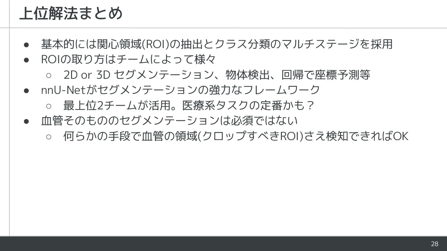 • nnU-Netがセグメンテーションの強力なフレームワーク ◦ 最上位2チームが活用。医療系タスクの定番かも? • 血管そのもののセグメンテーションは必須ではない ◦ 何らかの手段で血管の領域(クロップすべきROI)さえ検知できればOK 上位解法まとめ