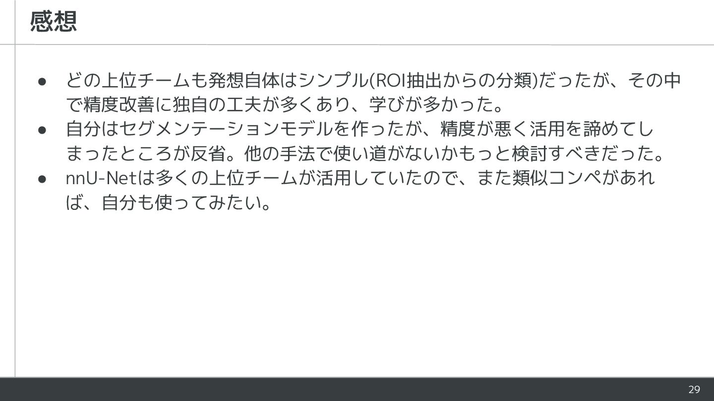 22. 28 • 基本的には関心領域(ROI)の抽出とクラス分類のマルチステージを採用 • ROIの取り方はチームによって様々 ◦ 2D or 3D セグメンテーション、物体検出、回帰で座標予測等