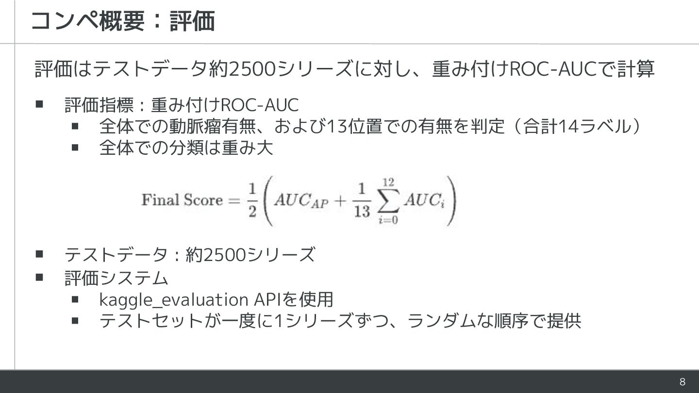 ▪ テストデータ : 約2500シリーズ ▪ 評価システム ▪ kaggle_evaluation APIを使用 ▪ テストセットが一度に1シリーズずつ、ランダムな順序で提供 評価はテストデータ約2500シリーズに対し、重み付けROC-AUCで計算