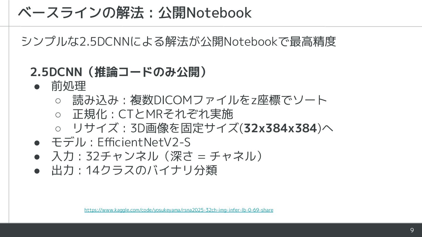 : CTとMRそれぞれ実施 ◦ リサイズ : 3D画像を固定サイズ(32x384x384)へ • モデル : EfficientNetV2-S • 入力 : 32チャンネル(深さ = チャネル) • 出力 : 14クラスのバイナリ分類 ベースラインの解法 : 公開Notebook シンプルな2.5DCNNによる解法が公開Notebookで最高精度 https://www.kaggle.com/code/yosukeyama/rsna2025-32ch-img-infer-lb-0-69-share