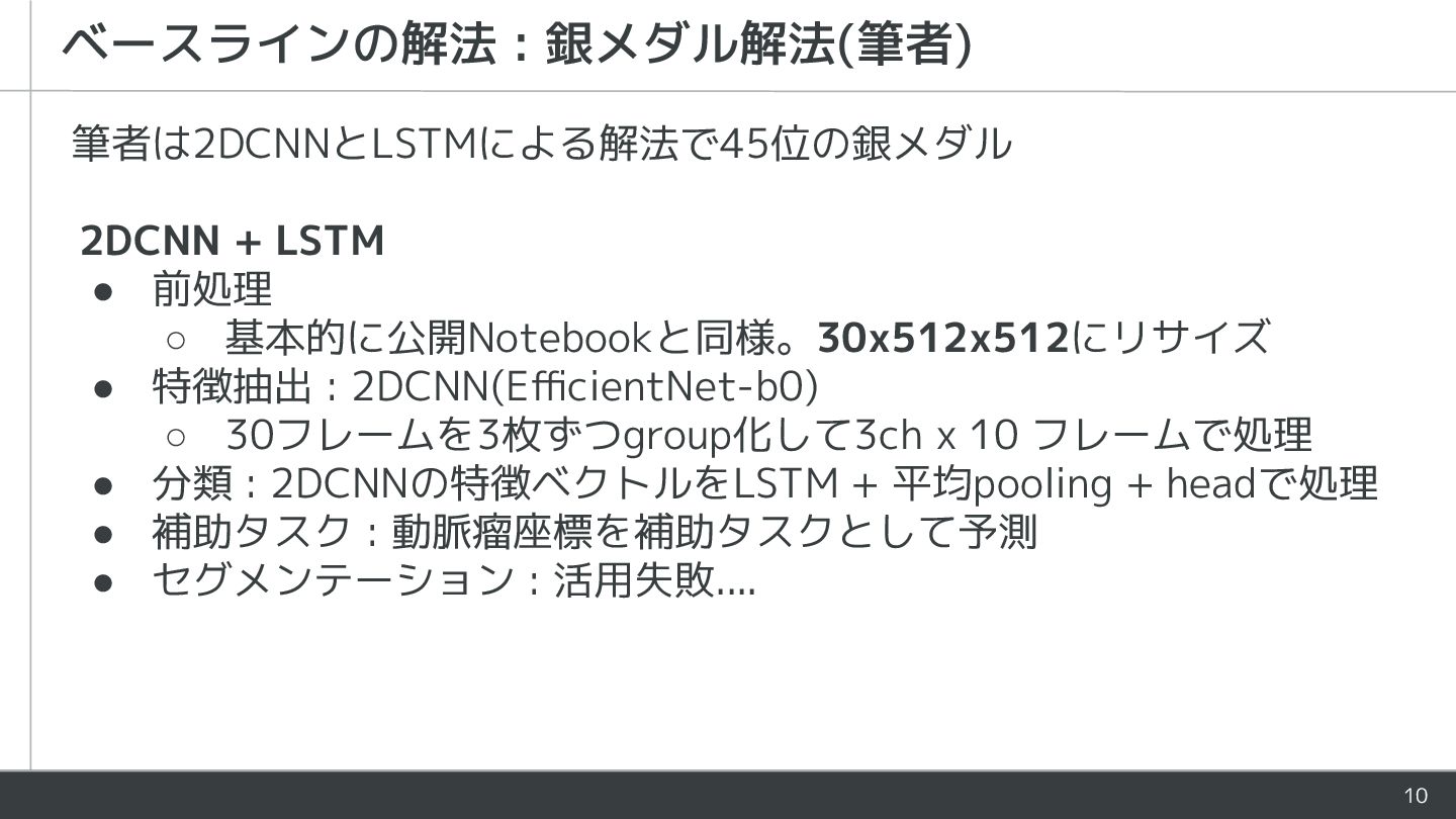 : 2DCNN(EfficientNet-b0) ◦ 30フレームを3枚ずつgroup化して3ch x 10 フレームで処理 • 分類 : 2DCNNの特徴ベクトルをLSTM + 平均pooling + headで処理 • 補助タスク : 動脈瘤座標を補助タスクとして予測 • セグメンテーション : 活用失敗.... ベースラインの解法 : 銀メダル解法(筆者) 筆者は2DCNNとLSTMによる解法で45位の銀メダル