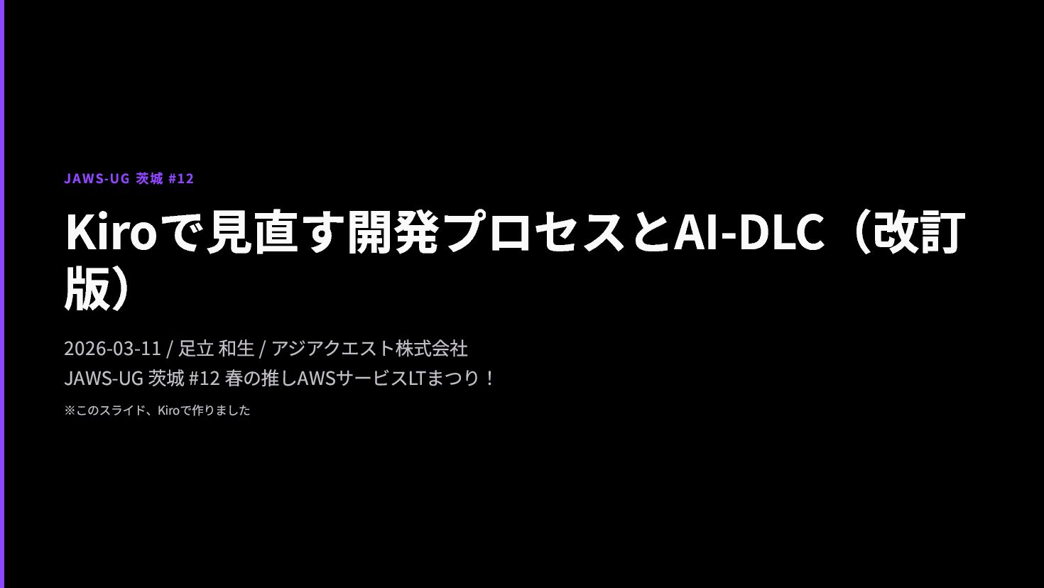 アジアクエスト株式会社 JAWS-UG 茨城 #12 春の推しAWSサービスLTまつり! ※このスライド、Kiroで作りました