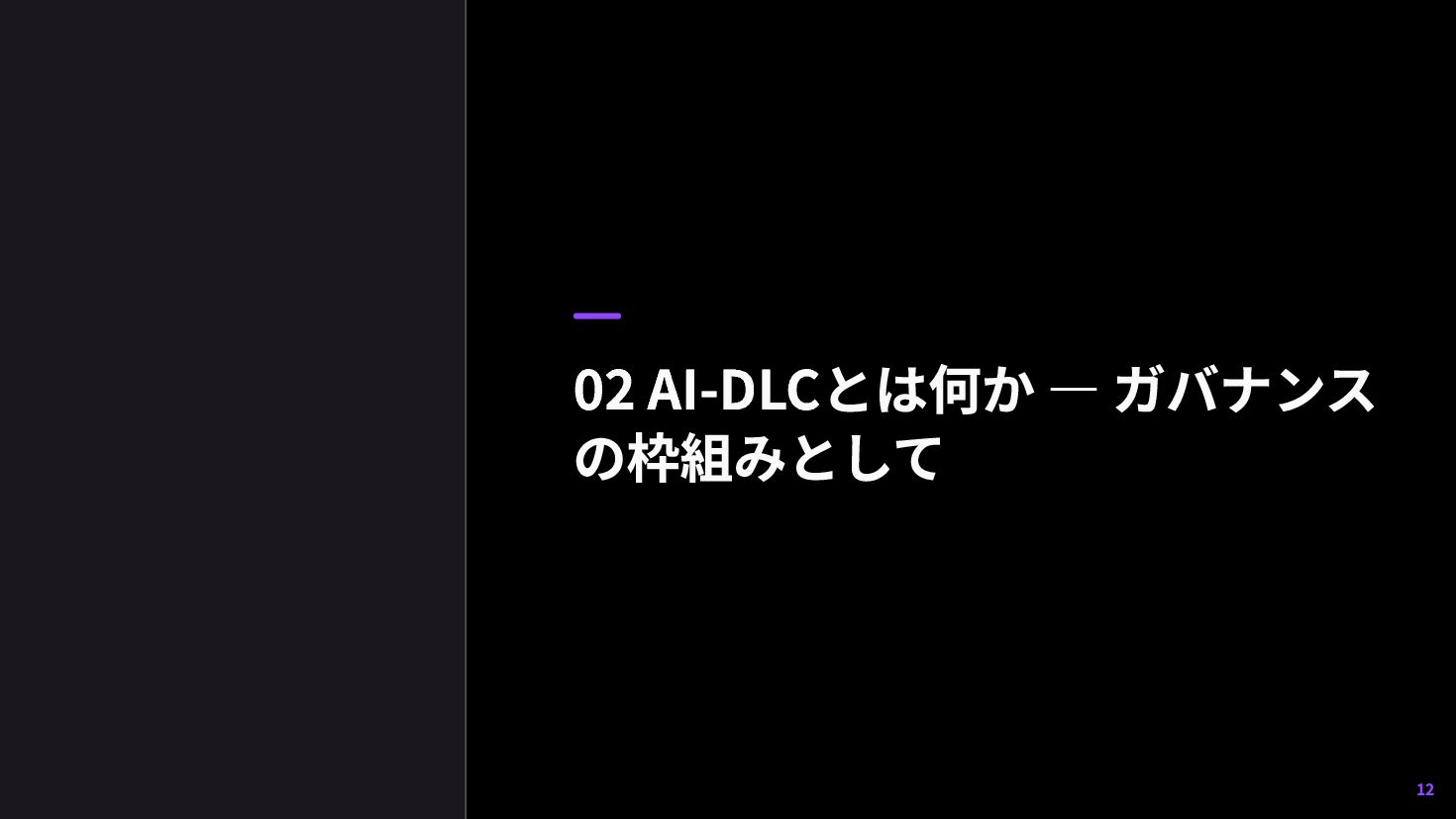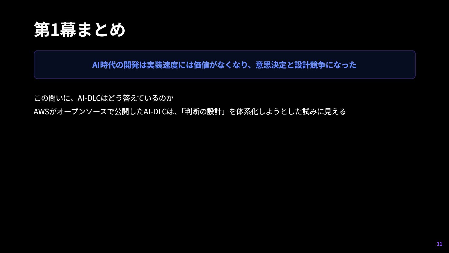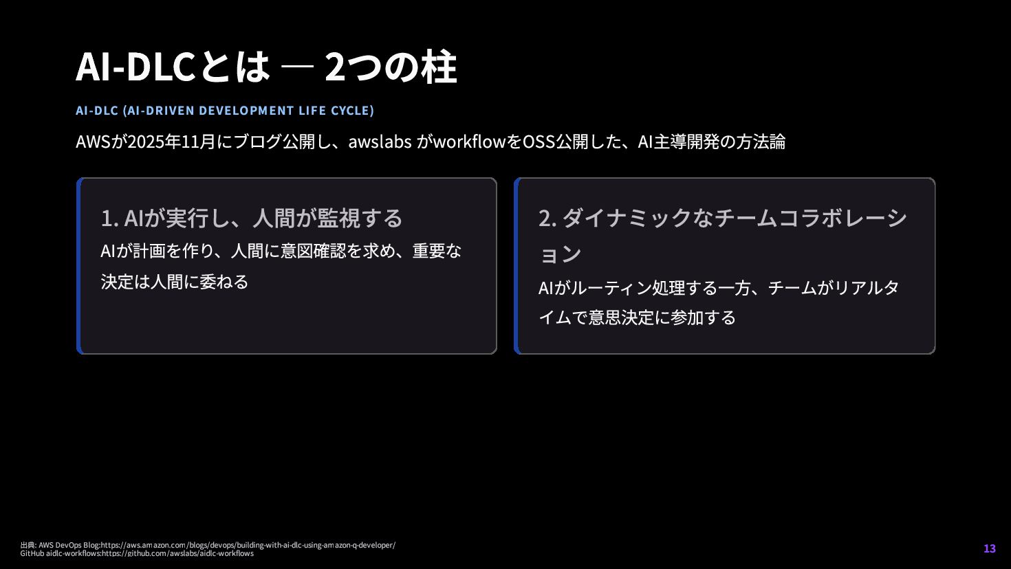7. AI-DLCとは — 2つの柱 AI-DLC (AI-DRIVEN DEVELOPMENT LIFE CYCLE) AWSが2025年11月にブログ公開し、awslabs がworkflowをOSS公開した、AI主導開発の方法論