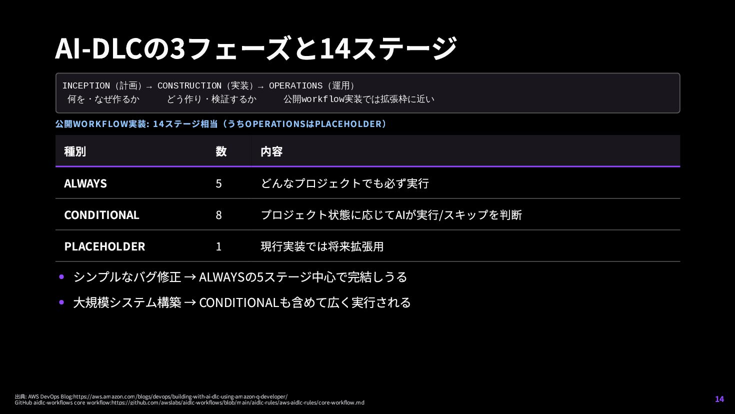 1. AIが実行し、人間が監視する AIが計画を作り、人間に意図確認を求め、重要な 決定は人間に委ねる 2. ダイナミックなチームコラボレーシ ョン AIがルーティン処理する一方、チームがリアルタ イムで意思決定に参加する 出典: AWS DevOps Blog:https://aws.amazon.com/blogs/devops/building-with-ai-dlc-using-amazon-q-developer/ GitHub aidlc-workflows:https://github.com/awslabs/aidlc-workflows 13