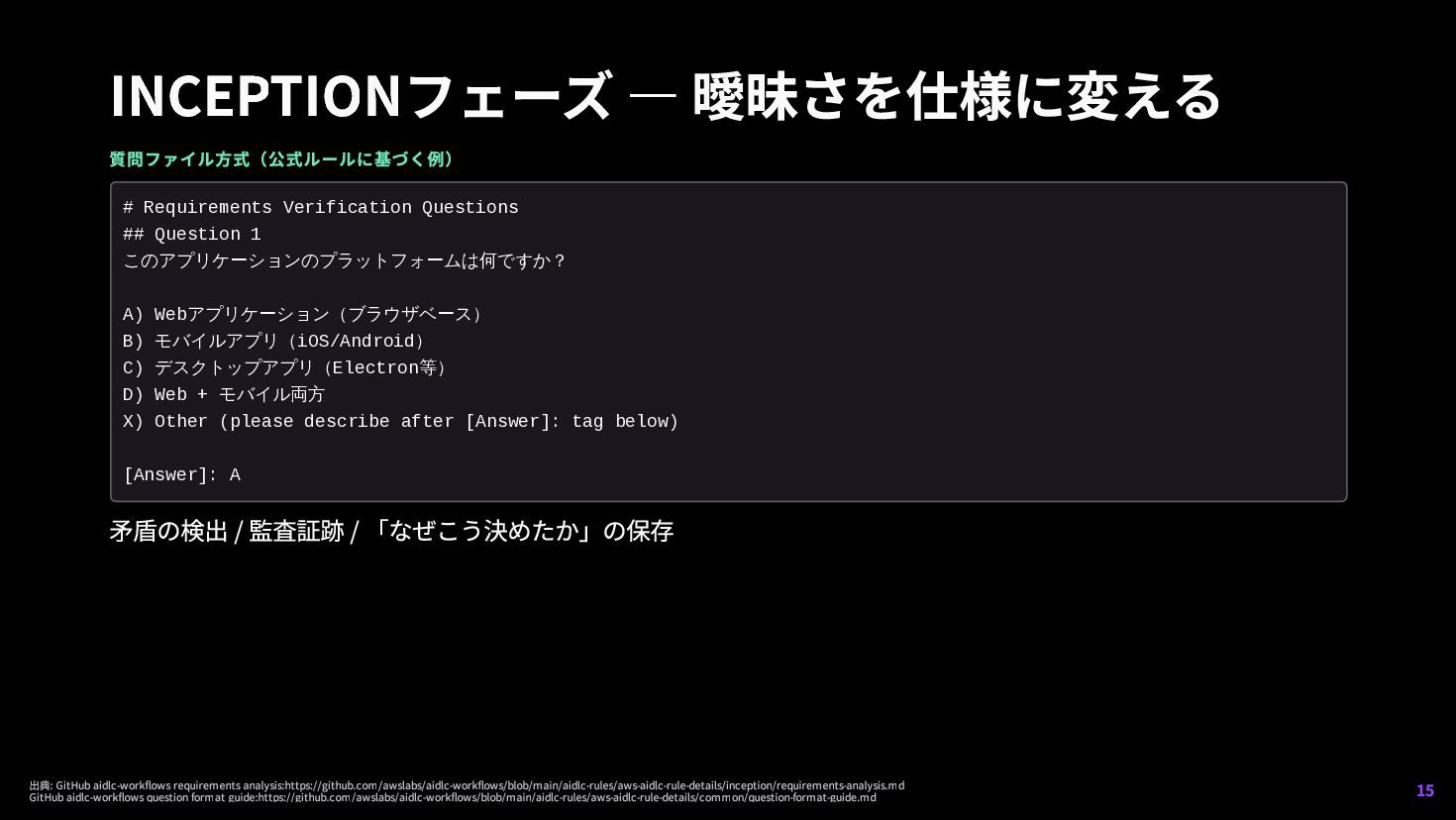 8 プロジェクト状態に応じてAIが実行/スキップを判断 PLACEHOLDER 1 現行実装では将来拡張用 シンプルなバグ修正 → ALWAYSの5ステージ中心で完結しうる 大規模システム構築 → CONDITIONALも含めて広く実行される INCEPTION(計画)→ CONSTRUCTION(実装)→ OPERATIONS(運用) 何を・なぜ作るか どう作り・検証するか 公開workflow実装では拡張枠に近い 出典: AWS DevOps Blog:https://aws.amazon.com/blogs/devops/building-with-ai-dlc-using-amazon-q-developer/ GitHub aidlc-workflows core workflow:https://github.com/awslabs/aidlc-workflows/blob/main/aidlc-rules/aws-aidlc-rules/core-workflow.md 14