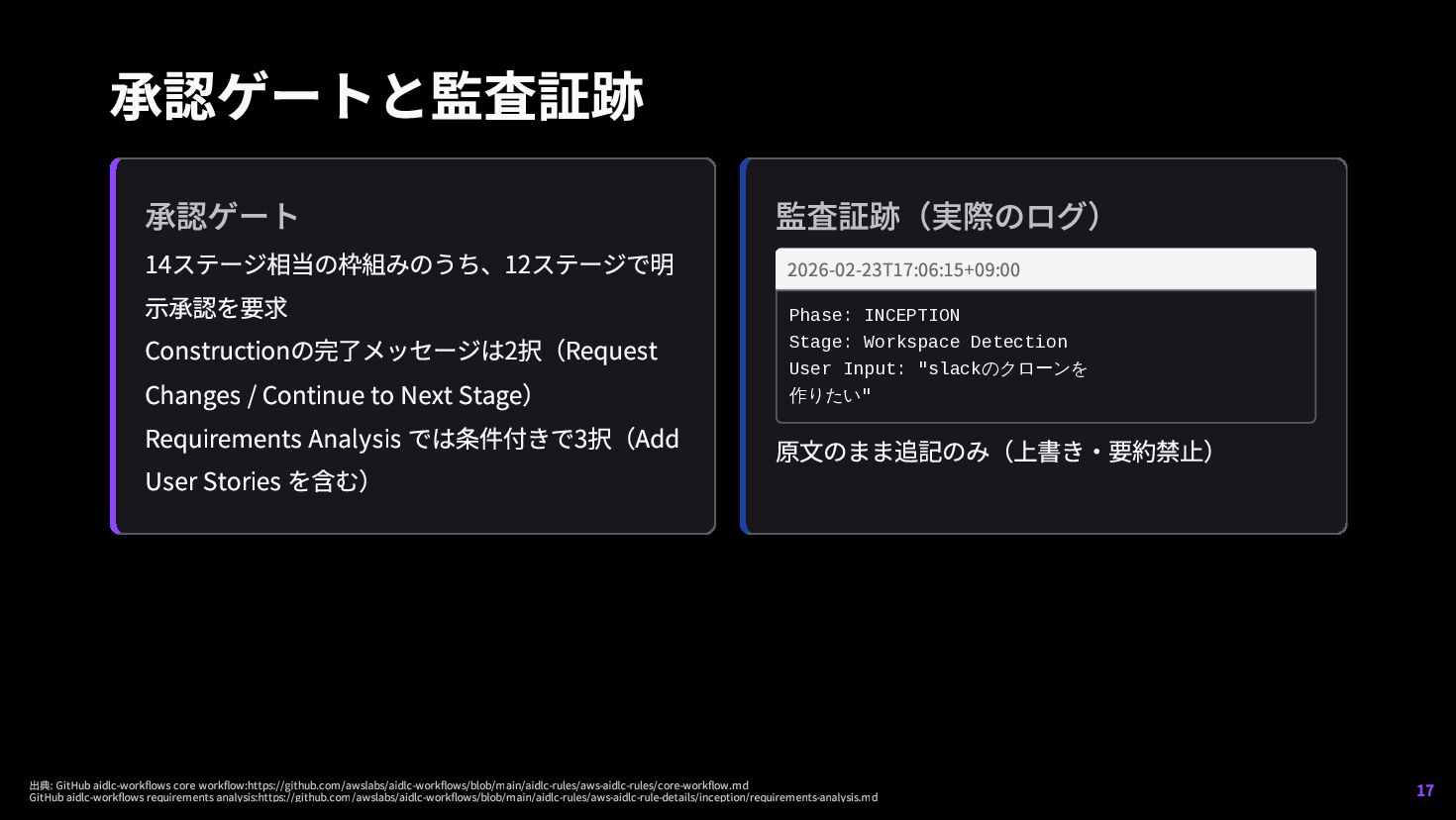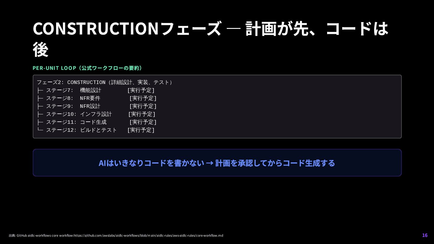 CONSTRUCTION(詳細設計、実装、テスト) ├─ ステージ7: 機能設計 [実行予定] ├─ ステージ8: NFR要件 [実行予定] ├─ ステージ9: NFR設計 [実行予定] ├─ ステージ10: インフラ設計 [実行予定] ├─ ステージ11: コード生成 [実行予定] └─ ステージ12: ビルドとテスト [実行予定] 出典: GitHub aidlc-workflows core workflow:https://github.com/awslabs/aidlc-workflows/blob/main/aidlc-rules/aws-aidlc-rules/core-workflow.md 16