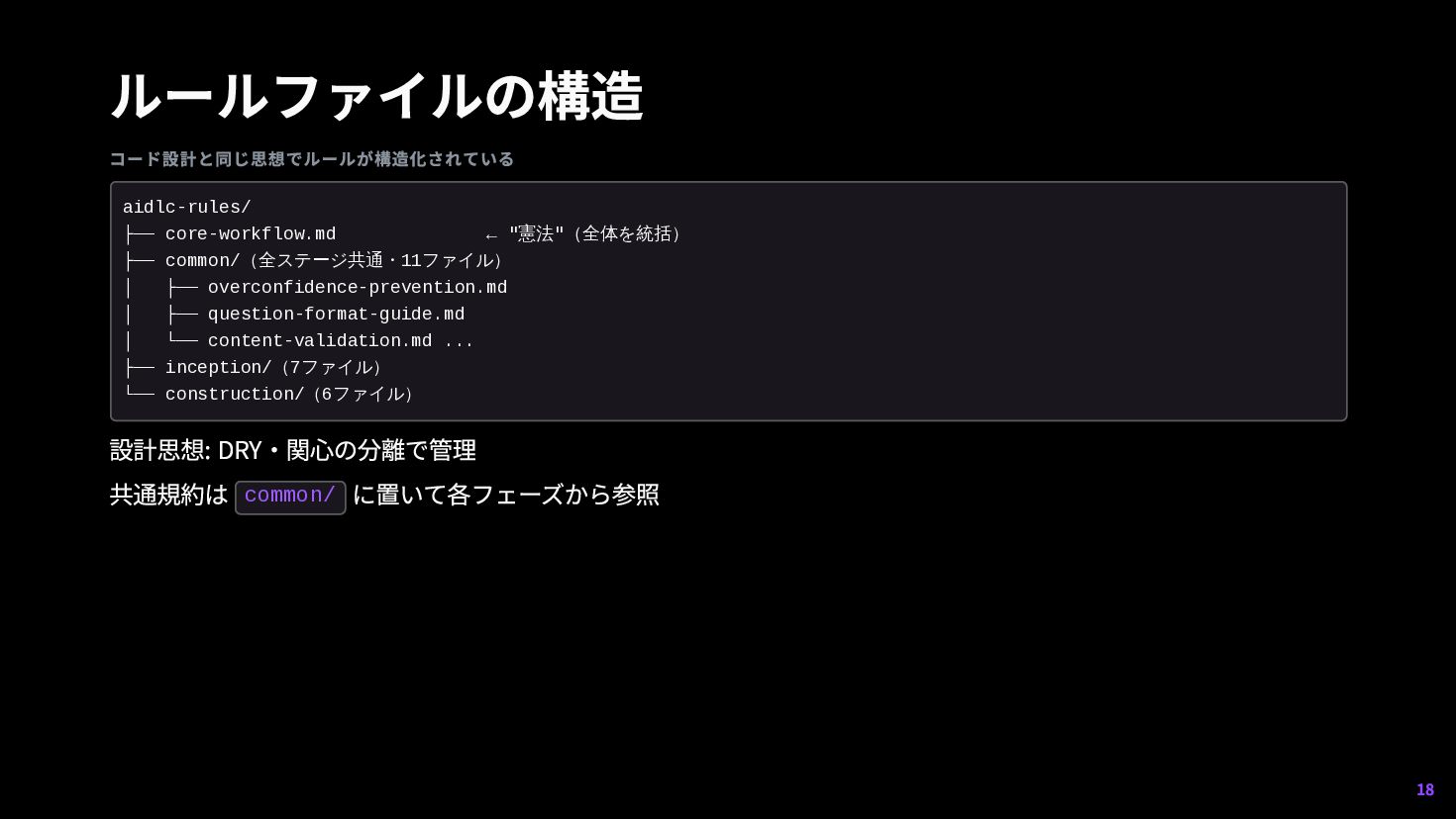 ← "憲法"(全体を統括) ├── common/(全ステージ共通・11ファイル) │ ├── overconfidence-prevention.md │ ├── question-format-guide.md │ └── content-validation.md ... ├── inception/(7ファイル) └── construction/(6ファイル) 18