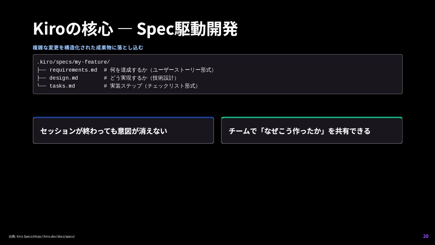 何を達成するか(ユーザーストーリー形式) ├── design.md # どう実現するか(技術設計) └── tasks.md # 実装ステップ(チェックリスト形式) 出典: Kiro Specs:https://kiro.dev/docs/specs/ 20
