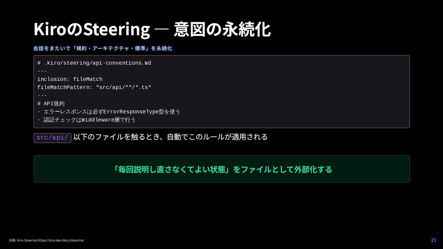 14. KiroのSteering — 意図の永続化 会話をまたいで「規約・アーキテクチャ・標準」を永続化 src/api/ 以下のファイルを触るとき、自動でこのルールが適用される 「毎回説明し直さなくてよい状態」をファイルとして外部化する # .kiro/steering/api-conventions.md ---