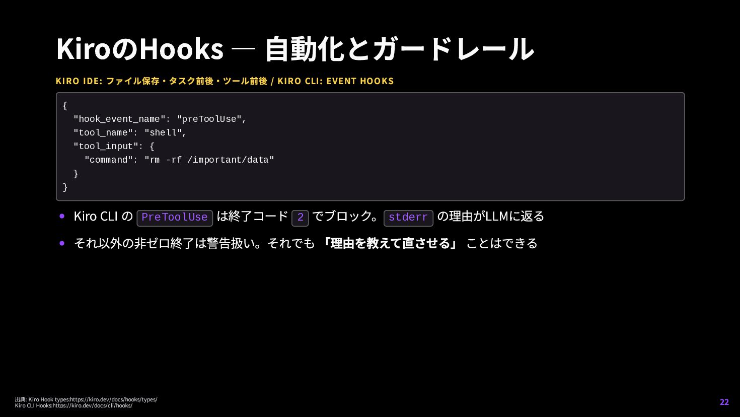 HOOKS Kiro CLI の PreToolUse は終了コード 2 でブロック。 stderr の理由がLLMに返る それ以外の非ゼロ終了は警告扱い。それでも 「理由を教えて直させる」 ことはできる { "hook_event_name": "preToolUse", "tool_name": "shell", "tool_input": { "command": "rm -rf /important/data" } } 出典: Kiro Hook types:https://kiro.dev/docs/hooks/types/ Kiro CLI Hooks:https://kiro.dev/docs/cli/hooks/ 22