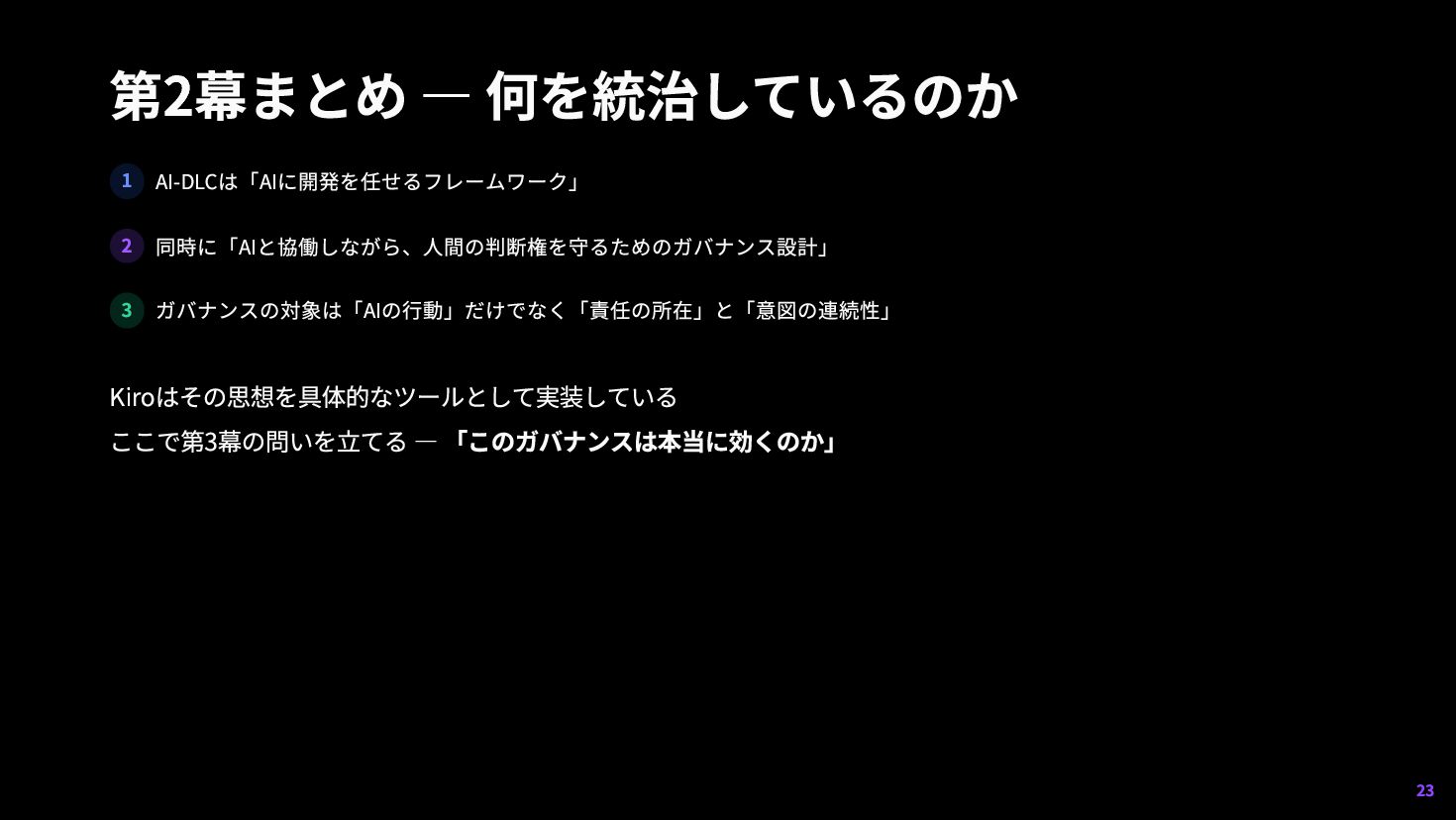 人間が担う 1 AI-DLCはAIに丸投げする方法ではない 2 ガバナンスの枠組みだが、その統治も完全ではない(自然言語の弱さ・レビュー承認疲れ) 3 今から整えるべきは: Spec・テスト・CI/HooksなどのHarness設計 40
