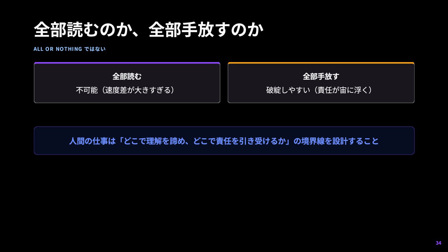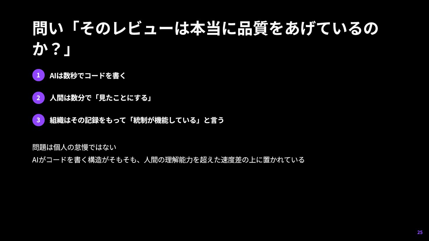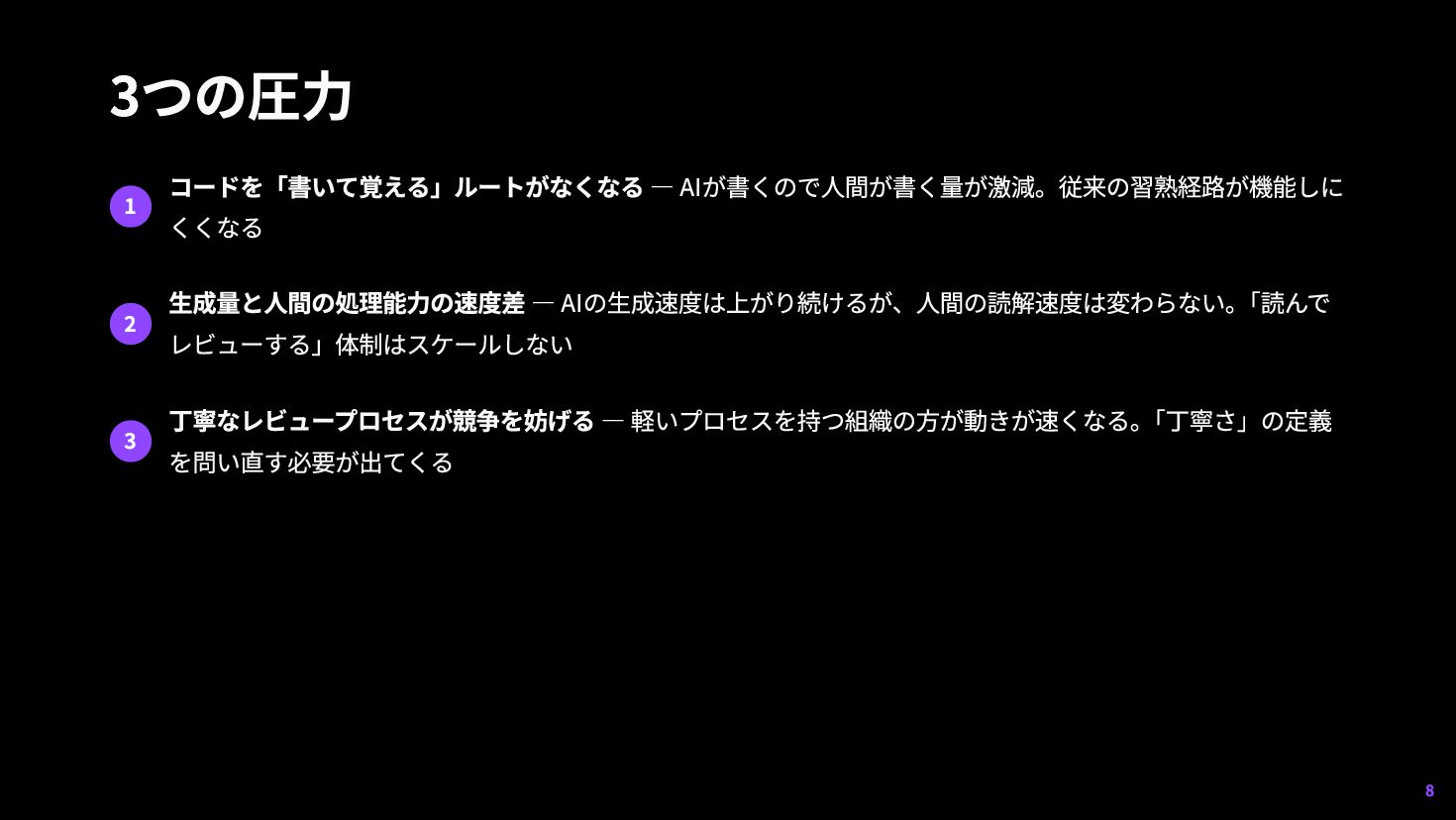 「読んで レビューする」体制はスケールしない 3 丁寧なレビュープロセスが競争を妨げる — 軽いプロセスを持つ組織の方が動きが速くなる。 「丁寧さ」の定義 を問い直す必要が出てくる 8