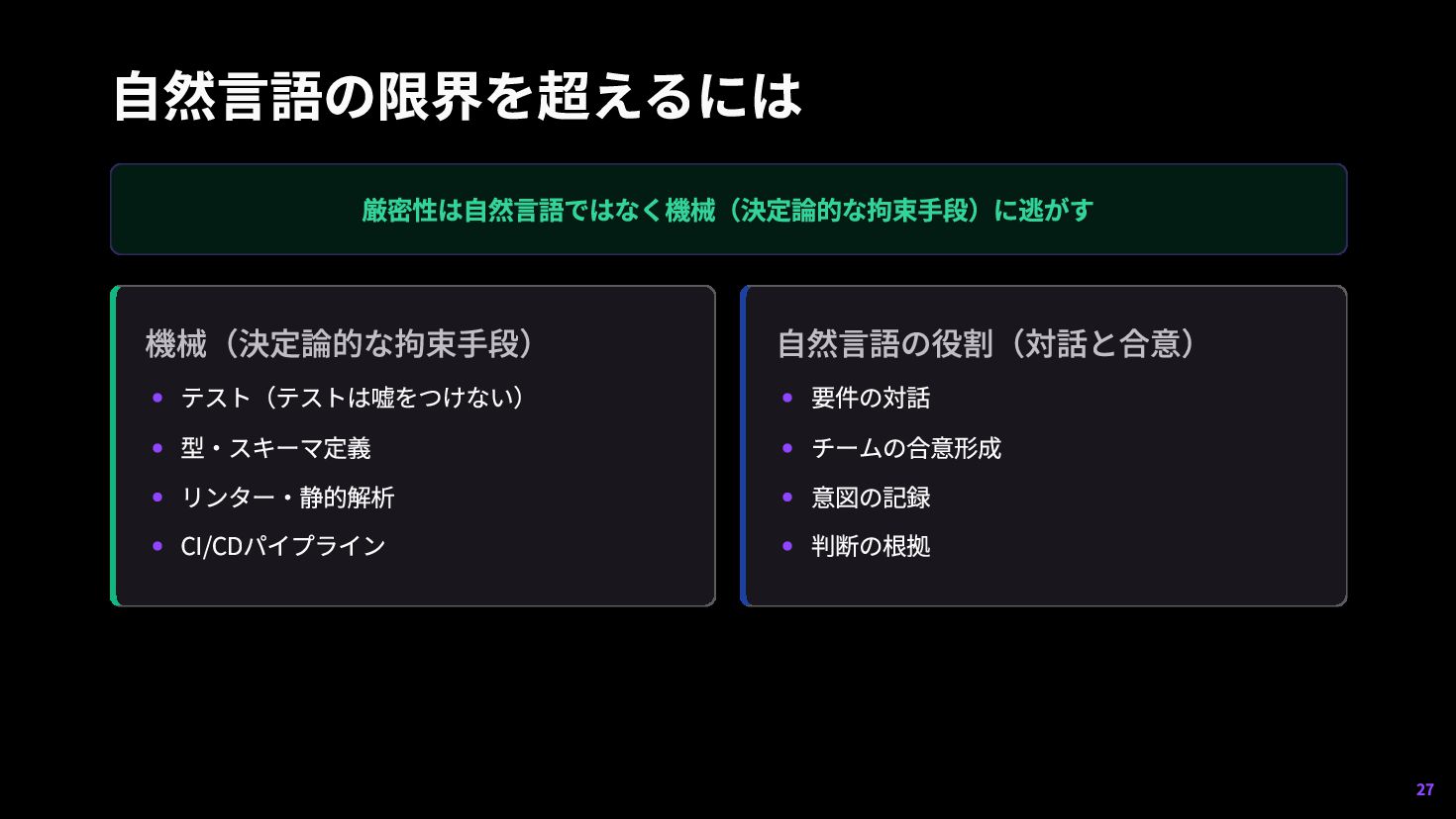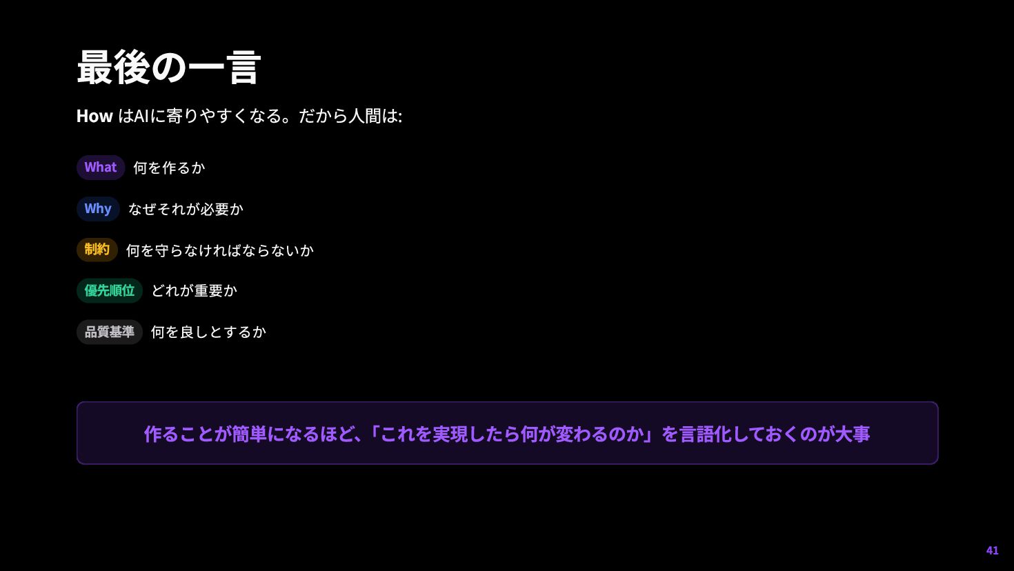24. 最後の一言 How はAIに寄りやすくなる。だから人間は: What 何を作るか Why なぜそれが必要か 制約 何を守らなければならないか 優先順位