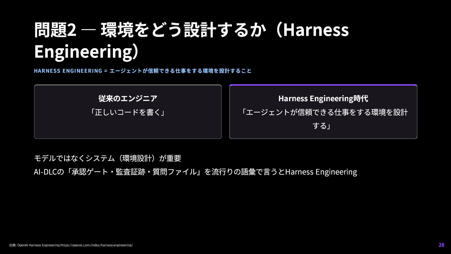 17. 問題2 — 環境をどう設計するか(Harness Engineering) HARNESS ENGINEERING = エージェントが信頼できる仕事をする環境を設計すること 従来のエンジニア 「正しいコードを書く」