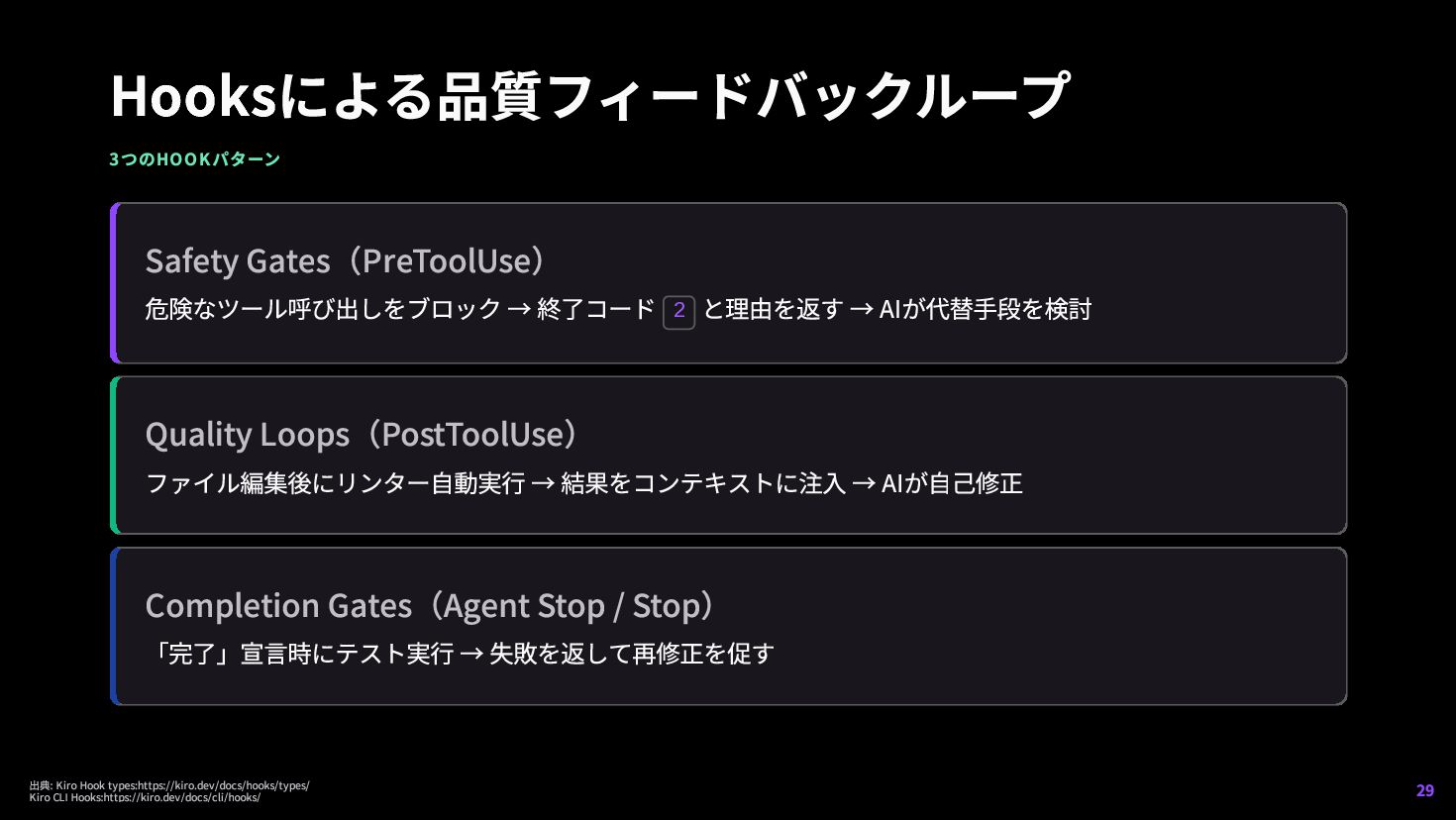 AIが代替手段を検討 Quality Loops(PostToolUse) ファイル編集後にリンター自動実行 → 結果をコンテキストに注入 → AIが自己修正 Completion Gates(Agent Stop / Stop) 「完了」宣言時にテスト実行 → 失敗を返して再修正を促す 出典: Kiro Hook types:https://kiro.dev/docs/hooks/types/ Kiro CLI Hooks:https://kiro.dev/docs/cli/hooks/ 29