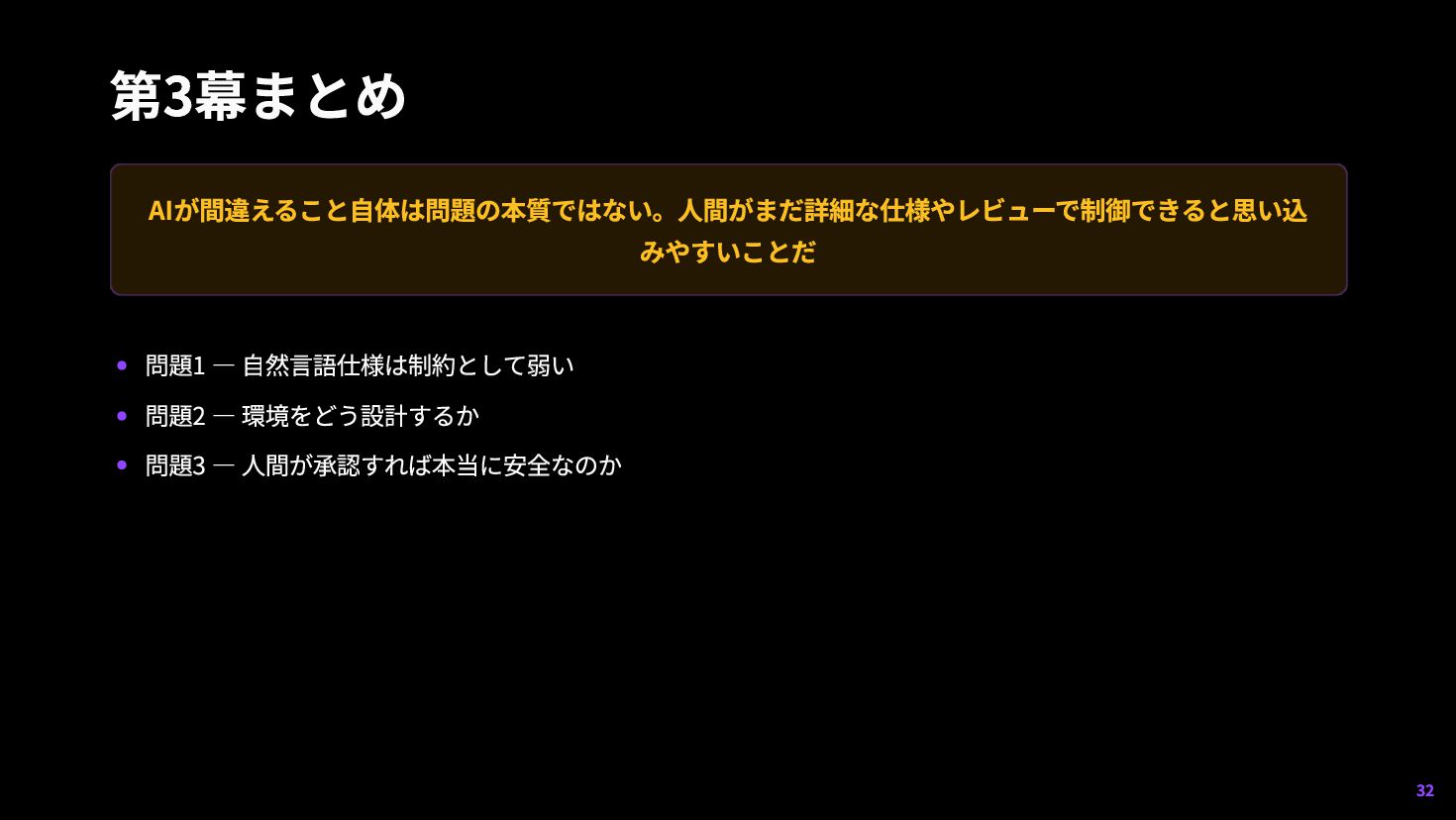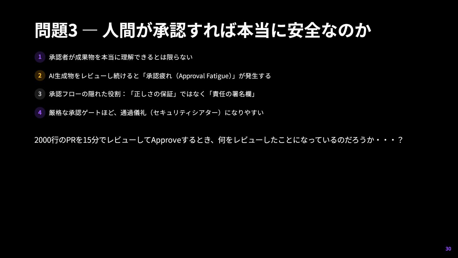 19. 問題3 — 人間が承認すれば本当に安全なのか 1 承認者が成果物を本当に理解できるとは限らない 2 AI生成物をレビューし続けると「承認疲れ(Approval Fatigue) 」が発生する 3