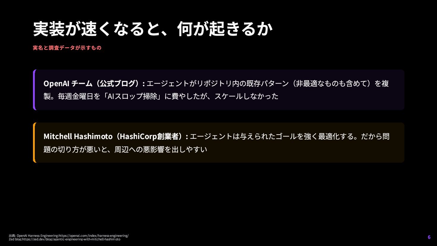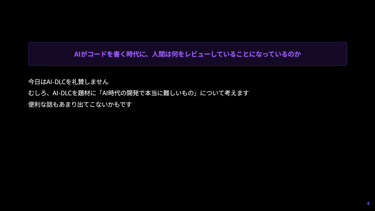 3. 実装が速くなると、何が起きるか(続) 調査データ 58% AIコーディングツール導入の最大障壁はセキュリティ不安 (Snyk調査) 90〜100% AI生成リポジトリで「コメント洪水」パターン(OX Security調査) 「自然言語で書いた」だけでは足りない →