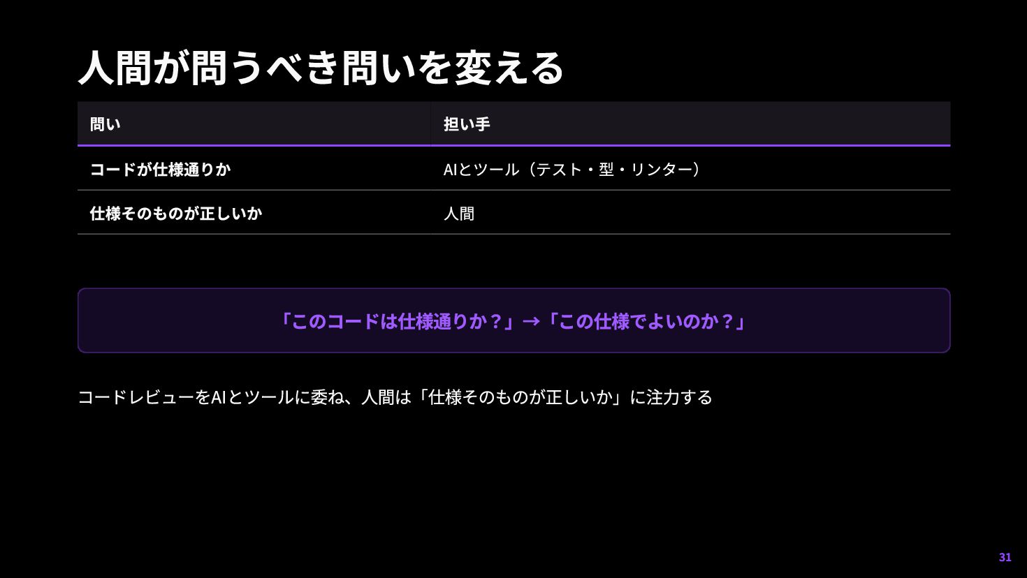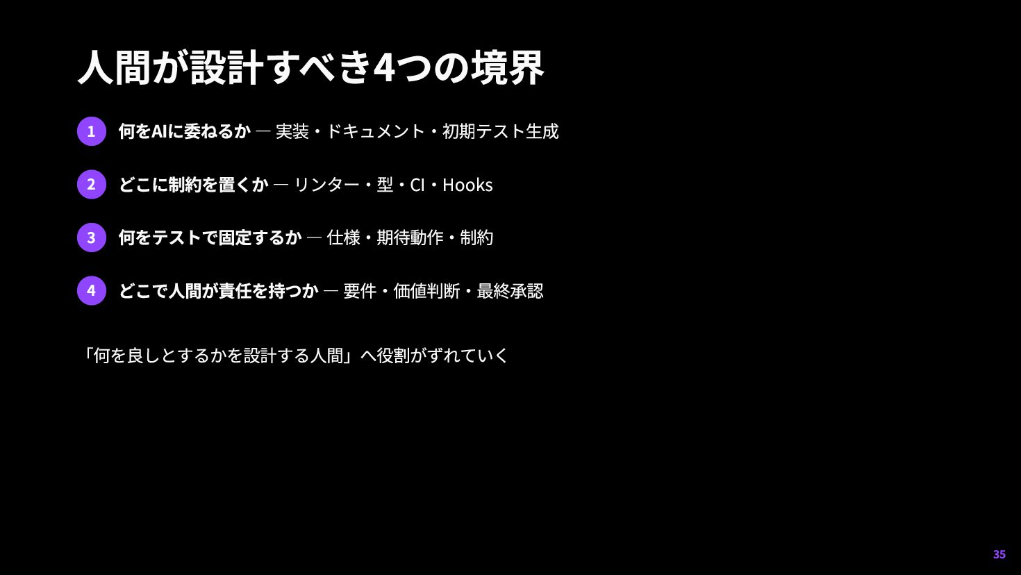 何をテストで固定するか — 仕様・期待動作・制約 4 どこで人間が責任を持つか — 要件・価値判断・最終承認 「何を良しとするかを設計する人間」へ役割がずれていく 35