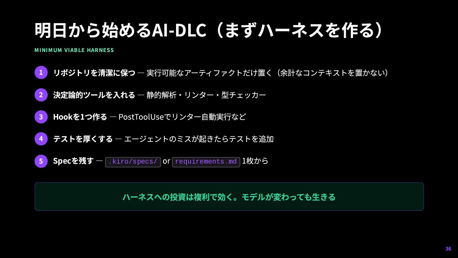 — 静的解析・リンター・型チェッカー 3 Hookを1つ作る — PostToolUseでリンター自動実行など 4 テストを厚くする — エージェントのミスが起きたらテストを追加 5 Specを残す — .kiro/specs/ or requirements.md 1枚から ハーネスへの投資は複利で効く。モデルが変わっても生きる 36