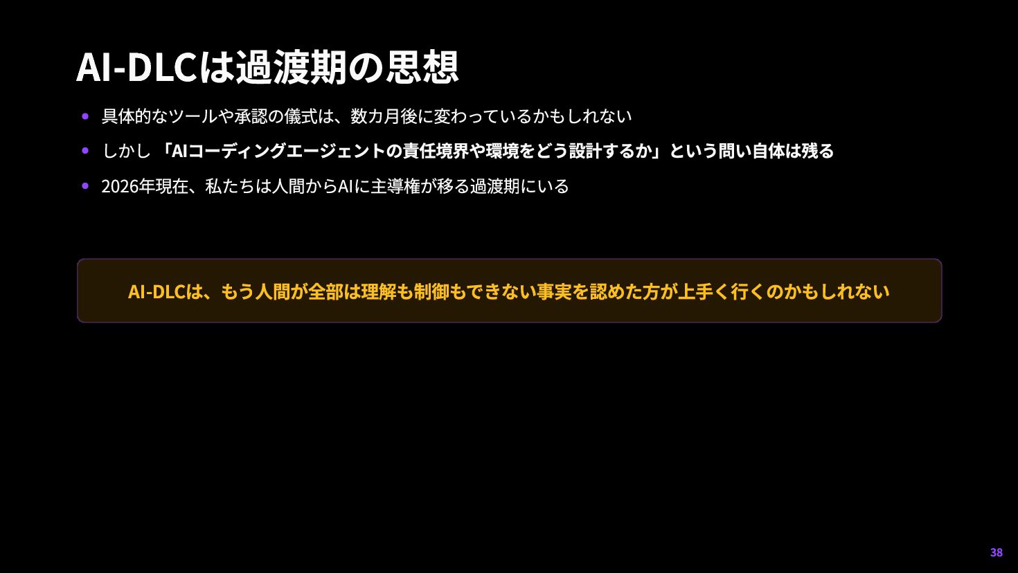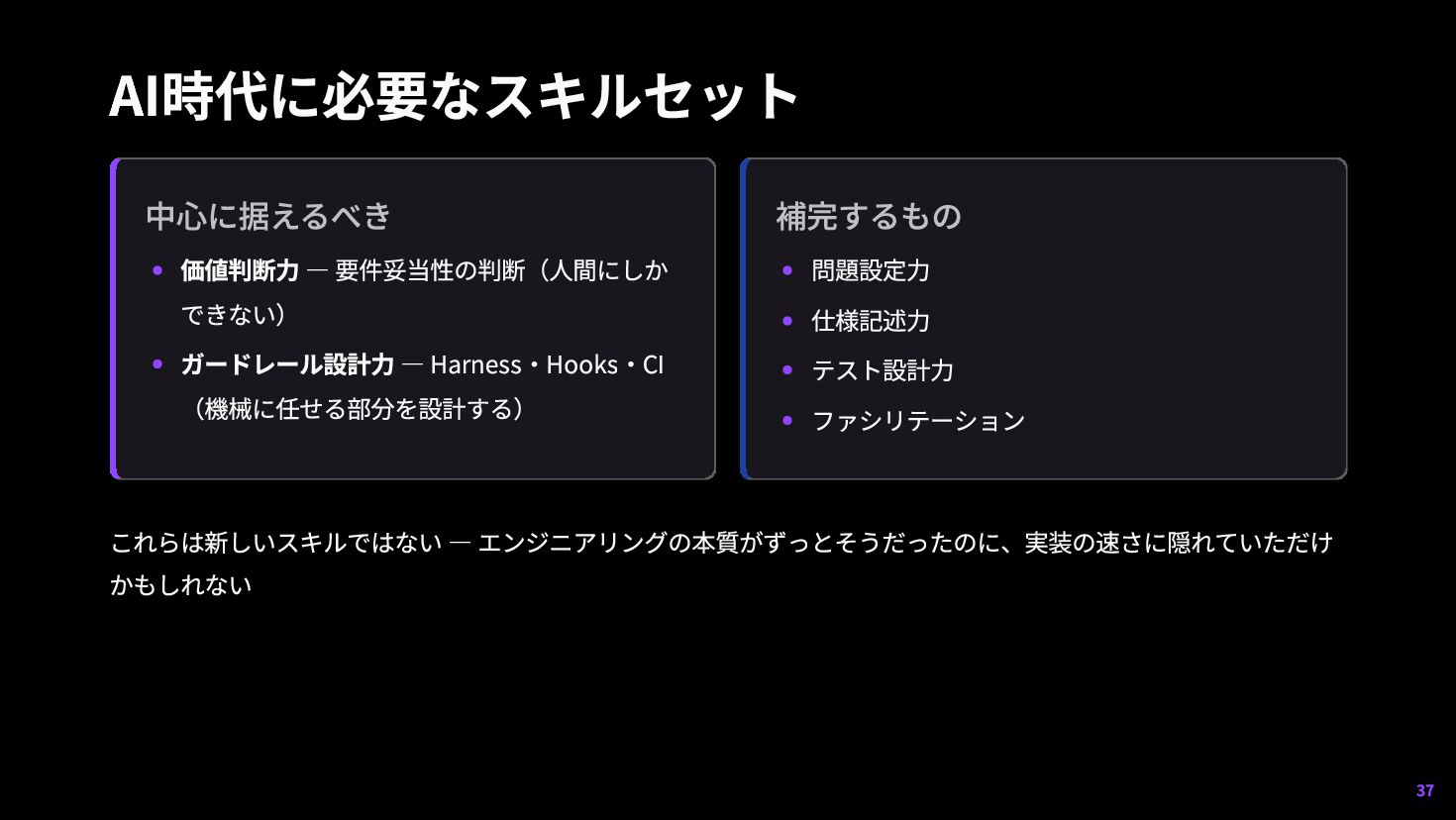 補完するもの 問題設定力 仕様記述力 テスト設計力 ファシリテーション これらは新しいスキルではない — エンジニアリングの本質がずっとそうだったのに、実装の速さに隠れていただけ かもしれない 37