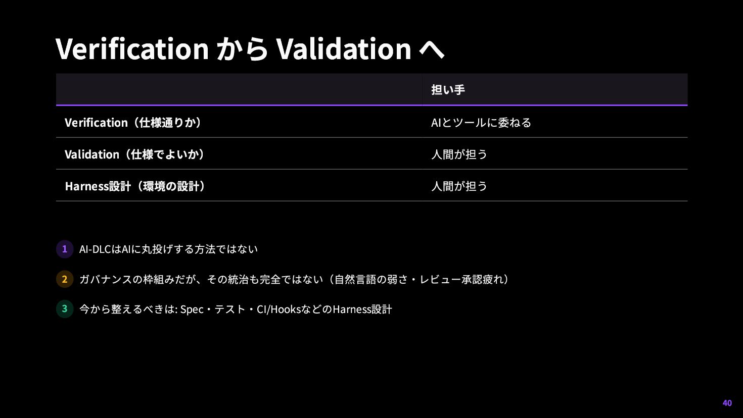 23. Verification から Validation へ 担い手 Verification(仕様通りか) AIとツールに委ねる Validation(仕様でよいか) 人間が担う Harness設計(環境の設計)