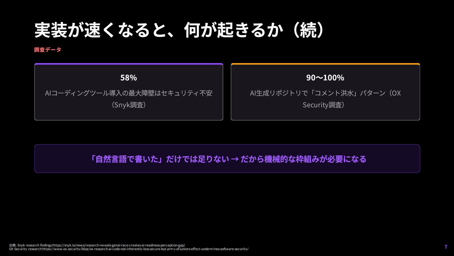 だから機械的な枠組みが必要になる 出典: Snyk research findings:https://snyk.io/news/research-reveals-genai-race-creates-ai-readiness-perception-gap/ OX Security research:https://www.ox.security/blog/ox-research-ai-code-not-inherently-less-secure-but-army-of-juniors-effect-undermines-software-security/ 7