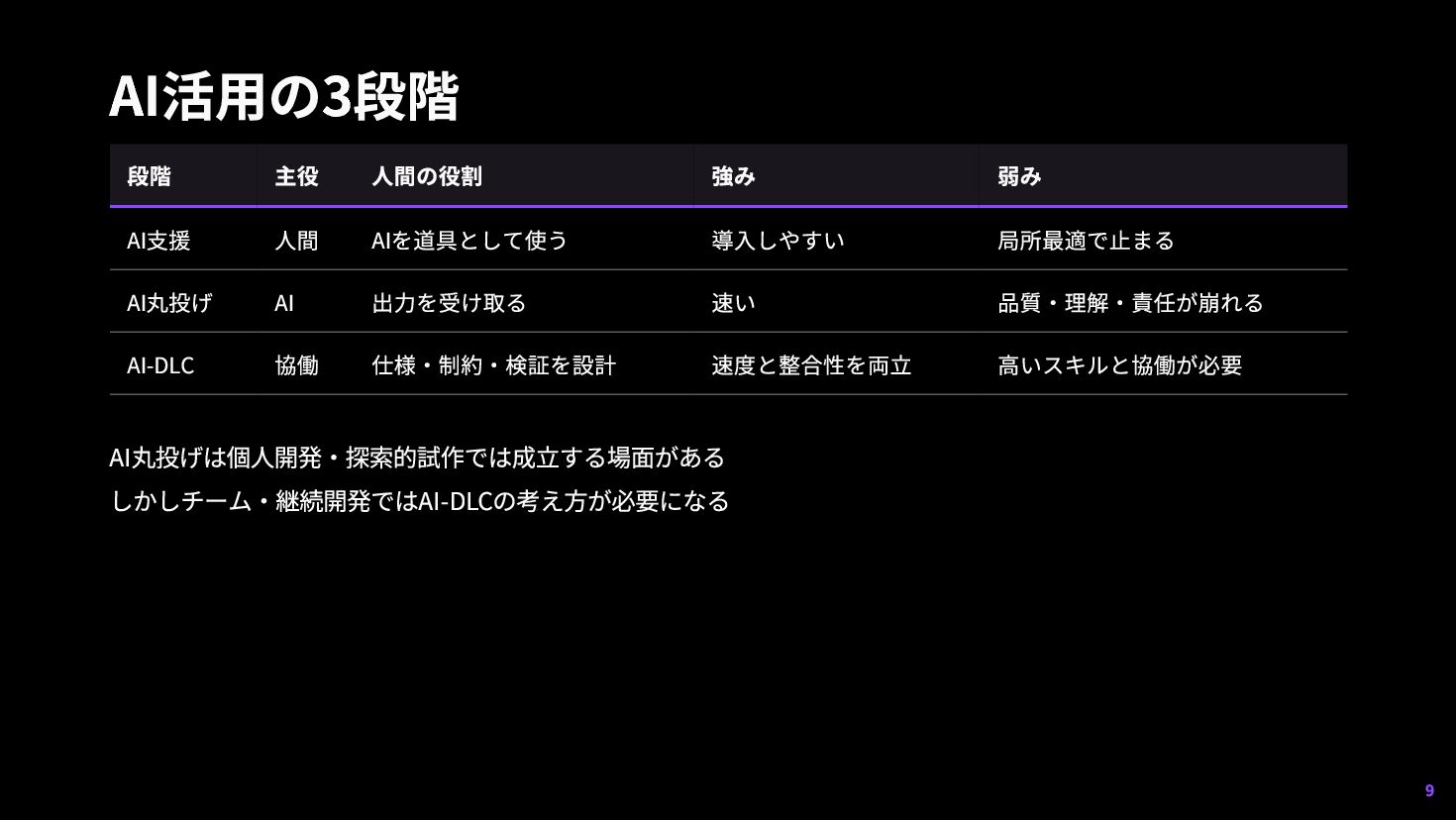 5. AI活用の3段階 段階 主役 人間の役割 強み 弱み AI支援 人間 AIを道具として使う 導入しやすい