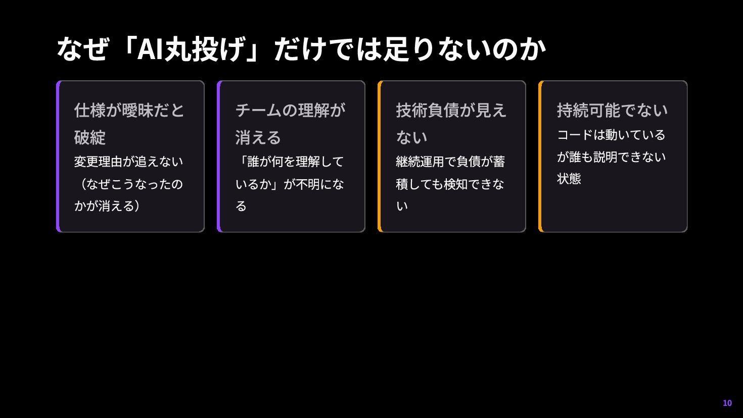 局所最適で止まる AI丸投げ AI 出力を受け取る 速い 品質・理解・責任が崩れる AI-DLC 協働 仕様・制約・検証を設計 速度と整合性を両立 高いスキルと協働が必要 AI丸投げは個人開発・探索的試作では成立する場面がある しかしチーム・継続開発ではAI-DLCの考え方が必要になる 9