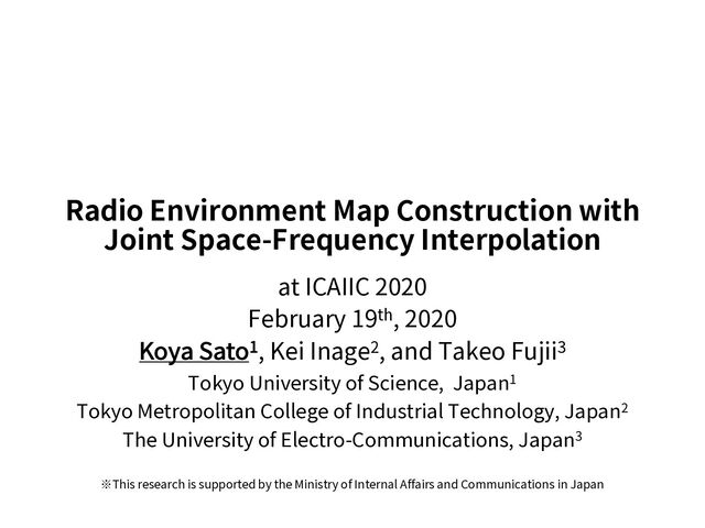 Koya Sato, Katsuya Suto, Kei Inage, Koichi Adachi, and Takeo Fujii, "Space-Frequency-Interpolated Radio Map," IEEE Trans. Veh. Technol., vol.70, no.1, pp.714-725, Jan. 2021.