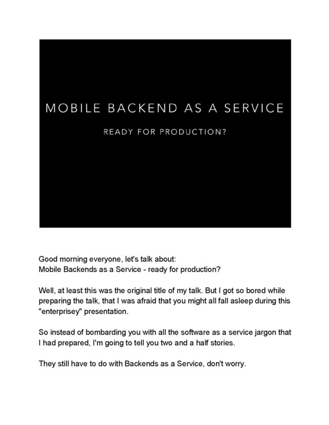 Service ready for production? Well, at least this was the original title of my talk. But I got so bored while preparing the talk, that I was afraid that you might all fall asleep during this "enterprisey" presentation. So instead of bombarding you with all the software as a service jargon that I had prepared, I'm going to tell you two and a half stories. They still have to do with Backends as a Service, don't worry.