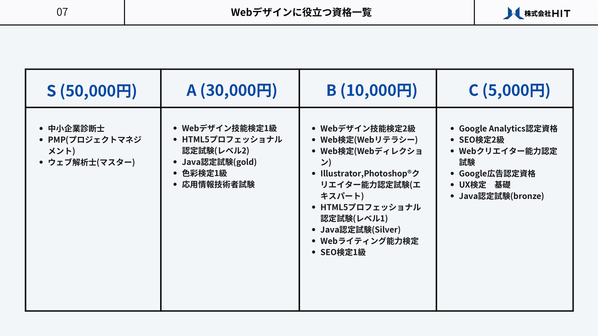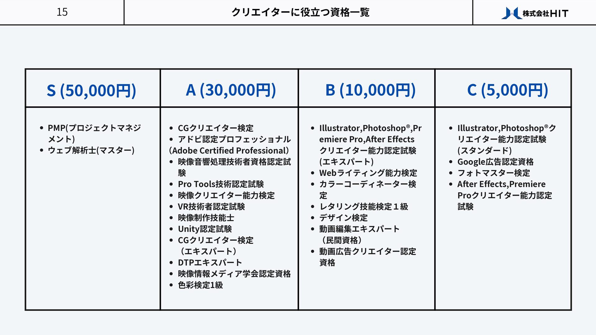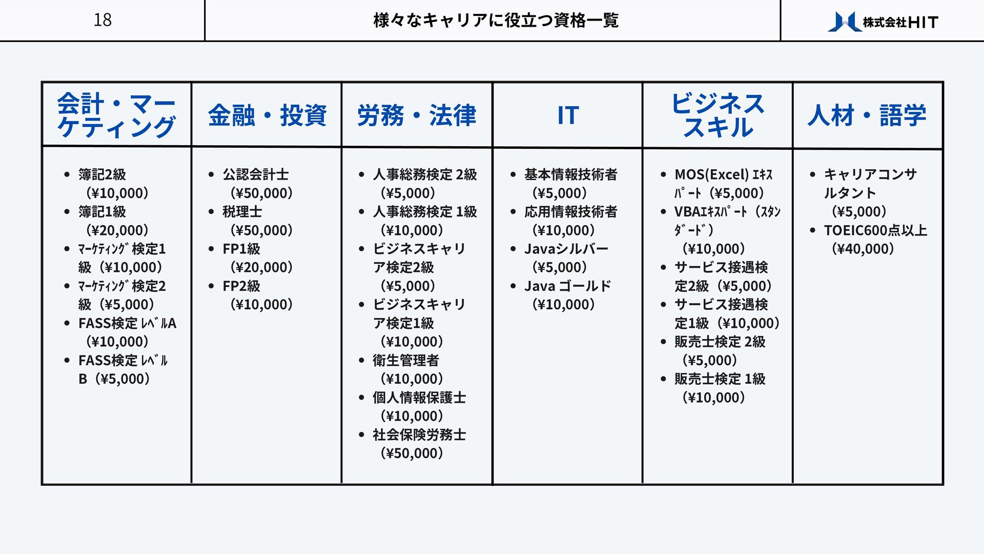 簿記2級 (¥10,000) 簿記1級 (¥20,000) マーケティング検定1 級(¥10,000) マーケティング検定2 級(¥5,000) FASS検定 レベルA (¥10,000) FASS検定 レベル B(¥5,000) 公認会計士 (¥50,000) 税理士 (¥50,000) FP1級 (¥20,000) FP2級 (¥10,000) 人事総務検定 2級 (¥5,000) 人事総務検定 1級 (¥10,000) ビジネスキャリ ア検定2級 (¥5,000) ビジネスキャリ ア検定1級 (¥10,000) 衛生管理者 (¥10,000) 個人情報保護士 (¥10,000) 社会保険労務士 (¥50,000) 基本情報技術者 (¥5,000) 応用情報技術者 (¥10,000) Javaシルバー (¥5,000) Java ゴールド (¥10,000) MOS(Excel) エキス パート(¥5,000) VBAエキスパート(スタン ダード) (¥10,000) サービス接遇検 定2級(¥5,000) サービス接遇検 定1級(¥10,000) 販売士検定 2級 (¥5,000) 販売士検定 1級 (¥10,000) キャリアコンサ ルタント (¥5,000) TOEIC600点以上 (¥40,000)