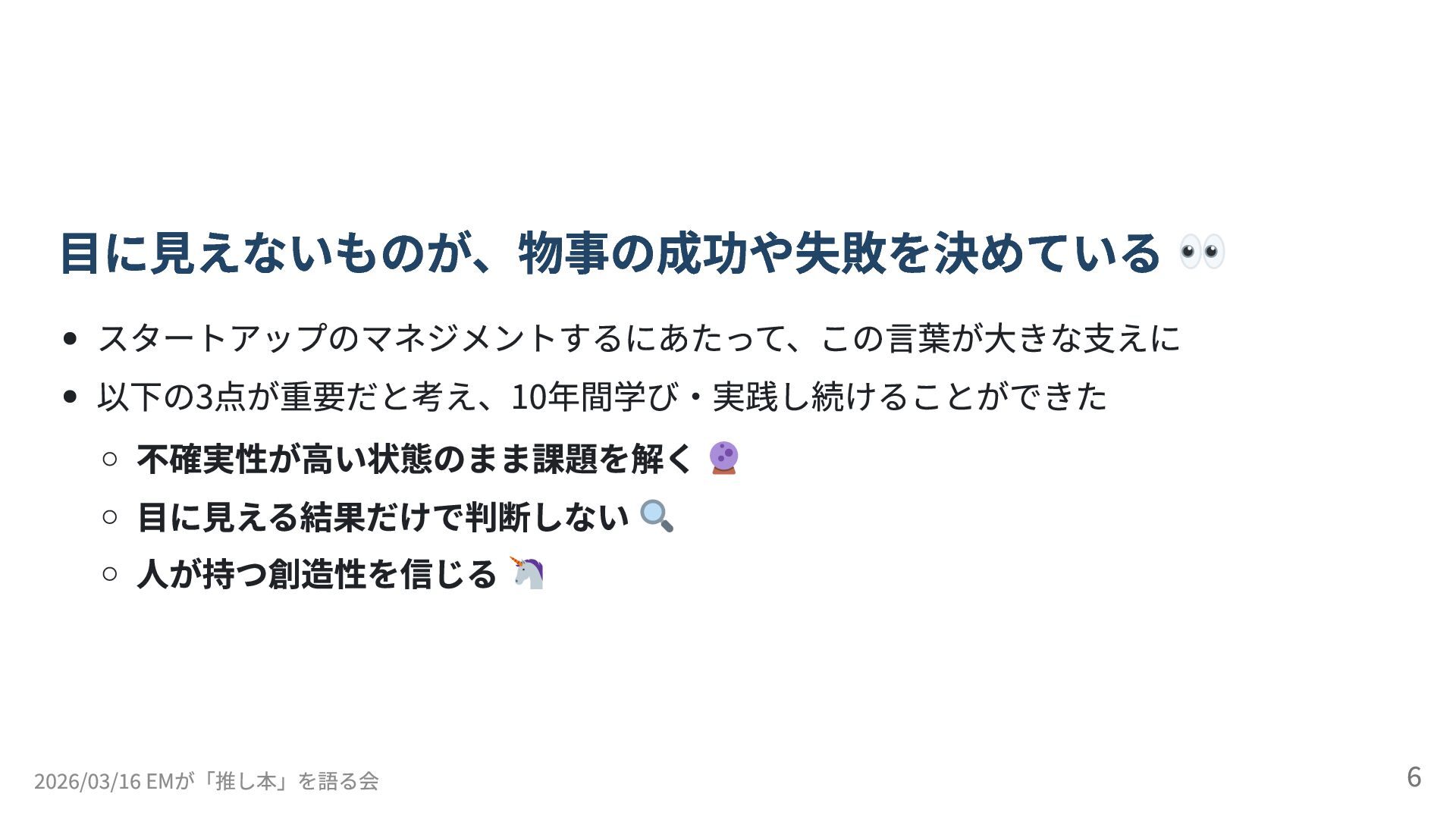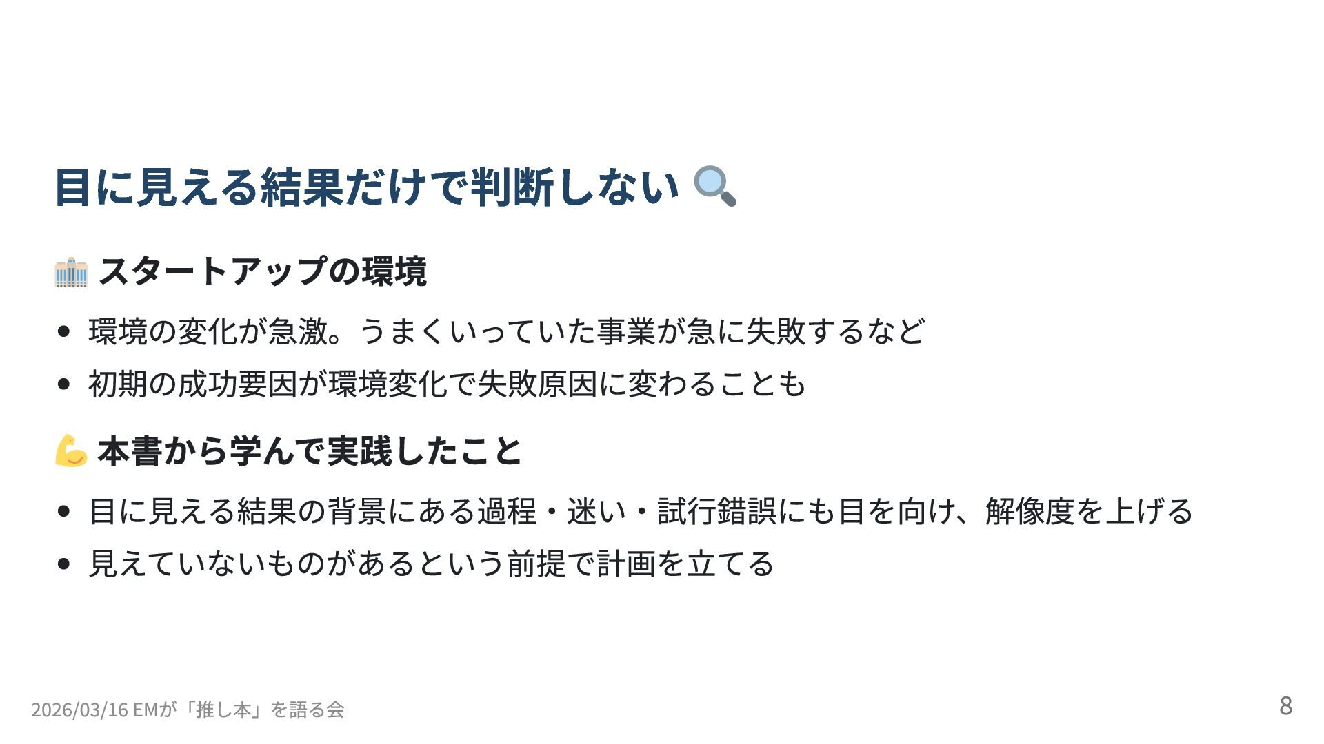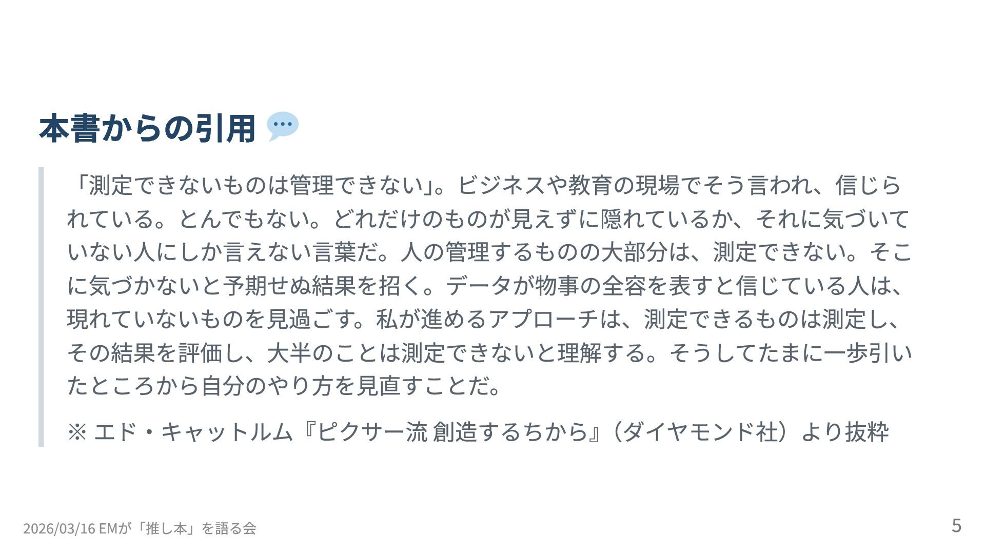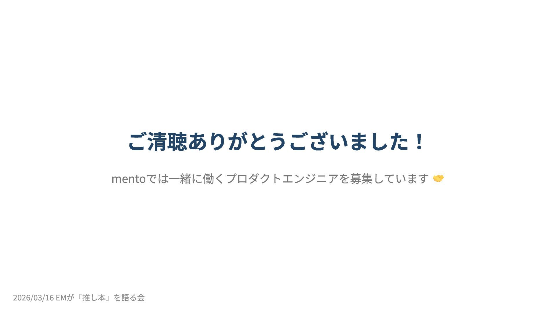 2026/03/16 開催の「EMが「推し本」を語る会 ーEMConf JP 2026 非公式サブイベント」のLT登壇(5分)の資料です。