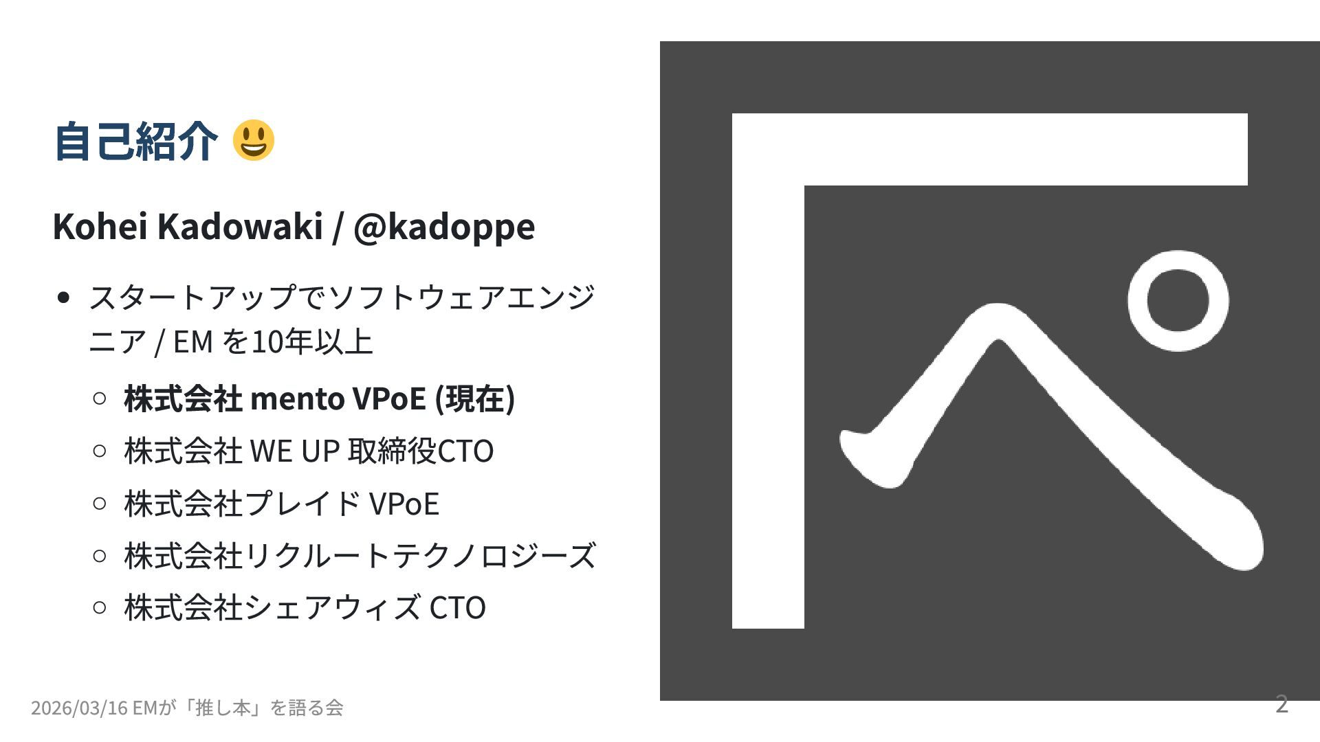 (現在) 株式会社 WE UP 取締役CTO 株式会社プレイド VPoE 株式会社リクルートテクノロジーズ 株式会社シェアウィズ CTO 2026/03/16 EMが「推し本」を語る会 2