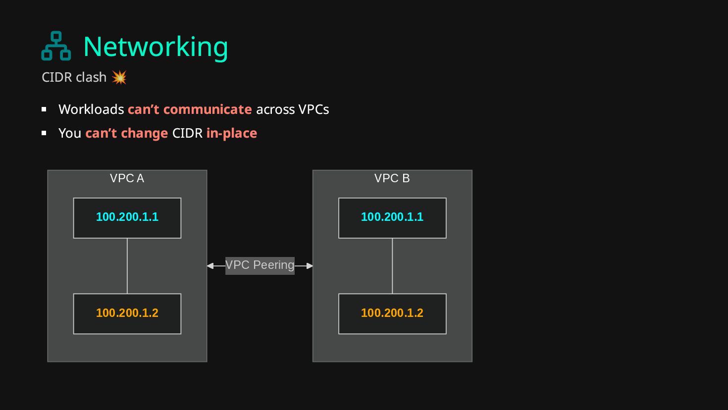 Networking Workloads can’t communicate across VPCs You can’t change CIDR