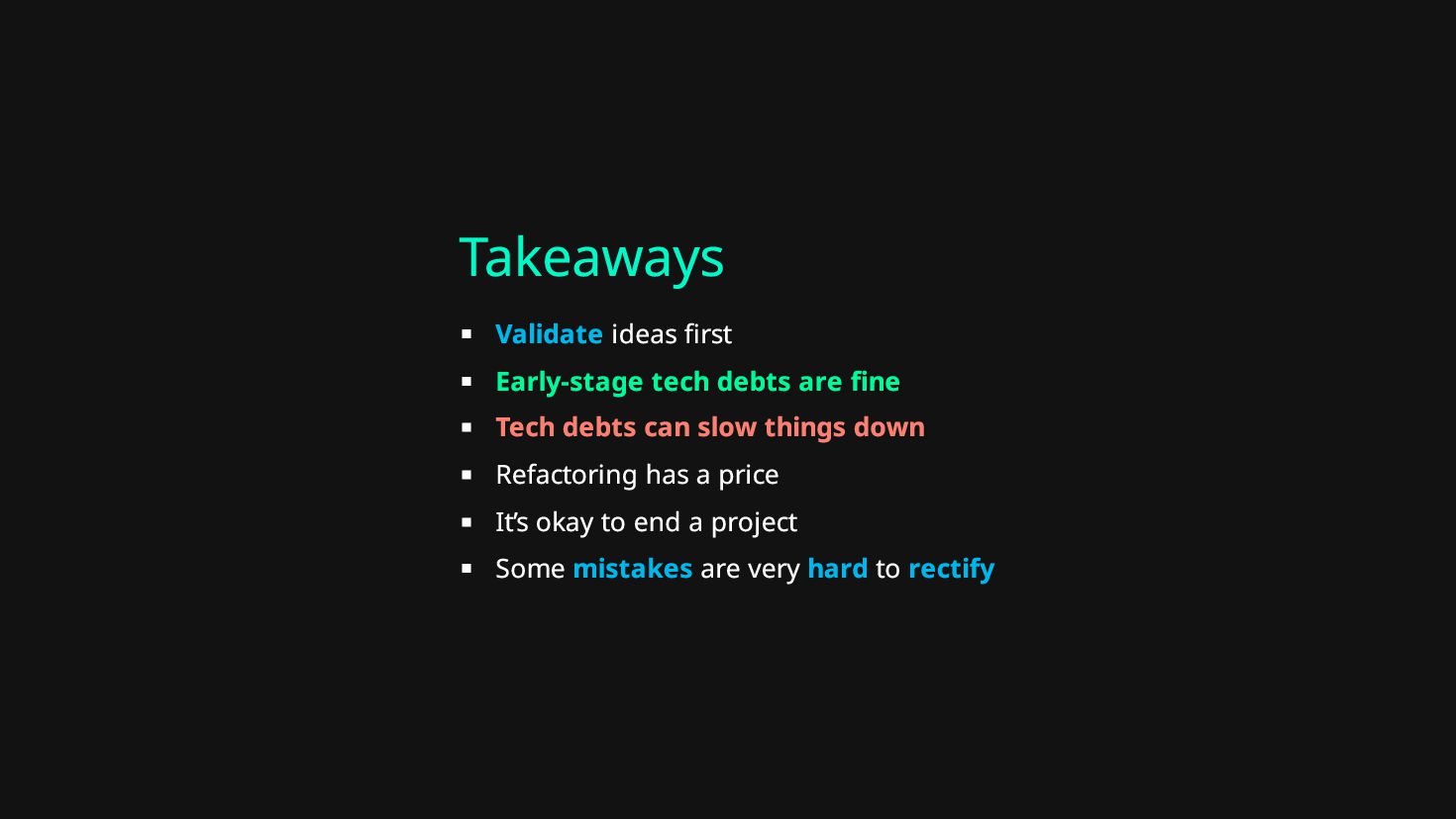 Takeaways Validate ideas first Early-stage tech debts are fine Tech
