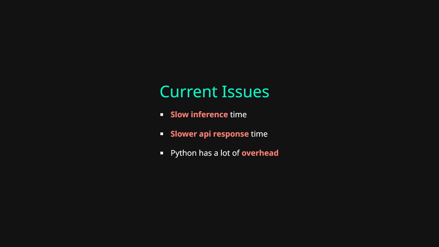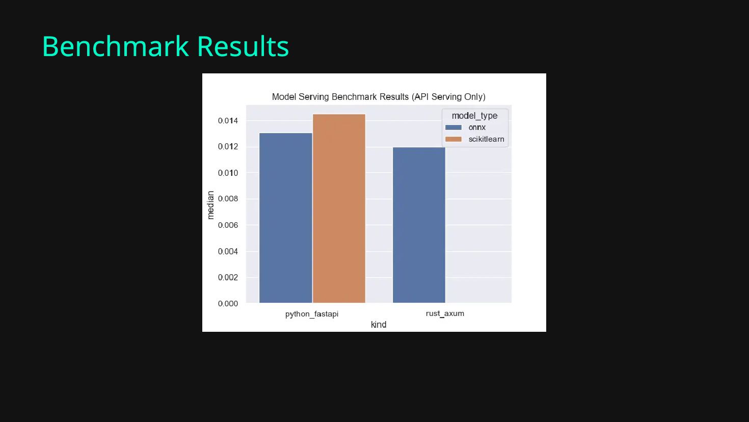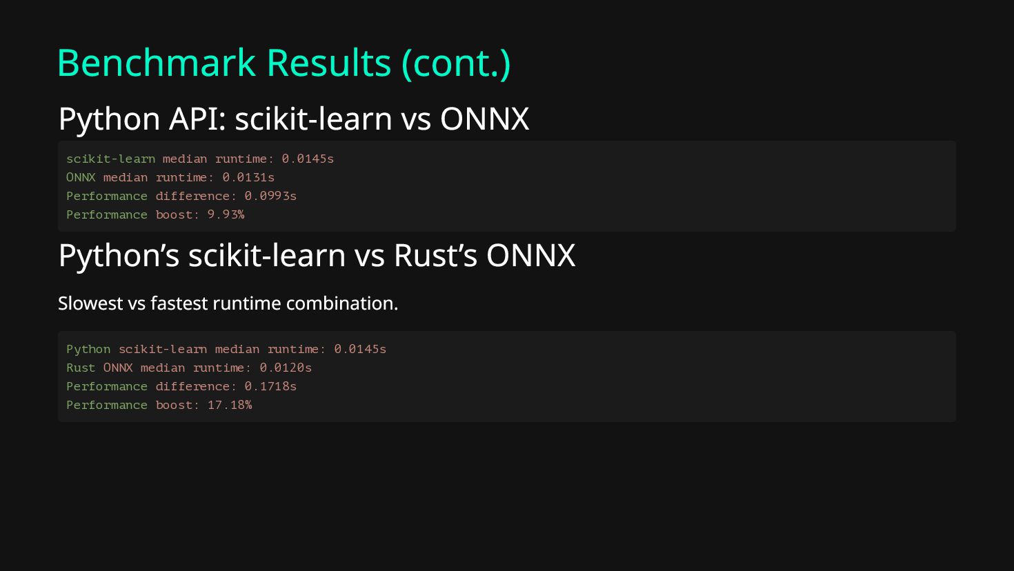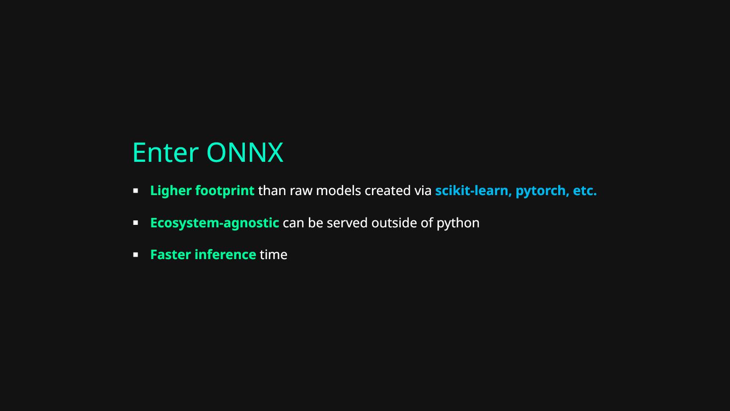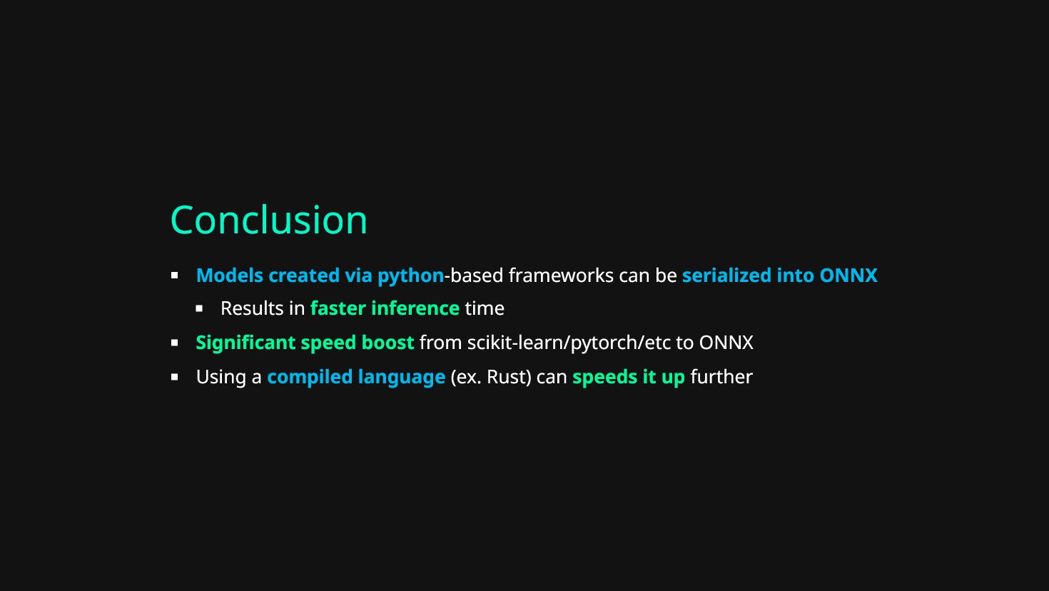ONNX Results in faster inference time Significant speed boost from scikit-learn/pytorch/etc to ONNX Using a compiled language (ex. Rust) can speeds it up further