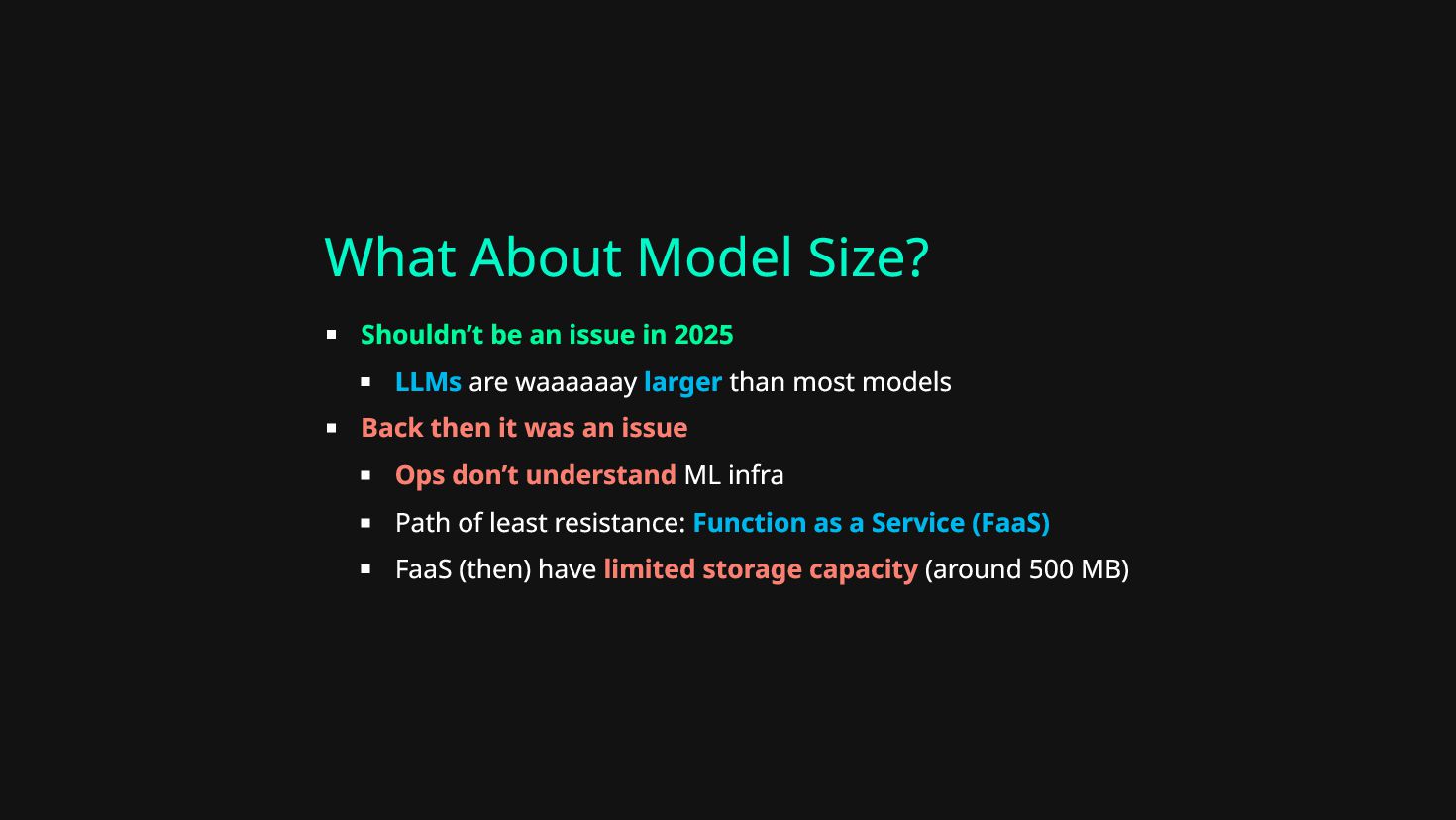 LLMs are waaaaaay larger than most models Back then it was an issue Ops don’t understand ML infra Path of least resistance: Function as a Service (FaaS) FaaS (then) have limited storage capacity (around 500 MB)