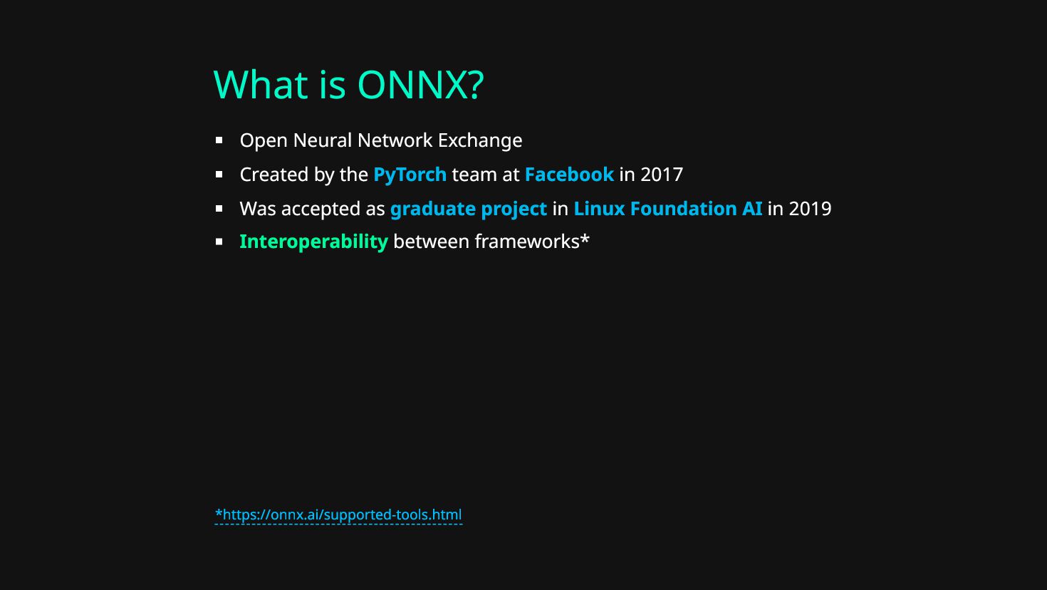 PyTorch team at Facebook in 2017 Was accepted as graduate project in Linux Foundation AI in 2019 Interoperability between frameworks* *https://onnx.ai/supported-tools.html