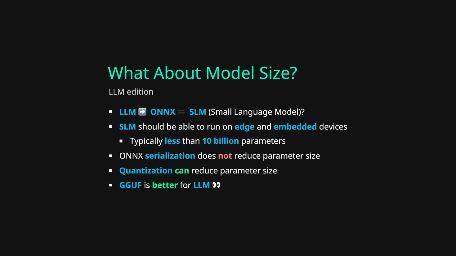 (Small Language Model)? SLM should be able to run on edge and embedded devices Typically less than 10 billion parameters ONNX serialization does not reduce parameter size Quantization can reduce parameter size GGUF is better for LLM 👀 LLM edition