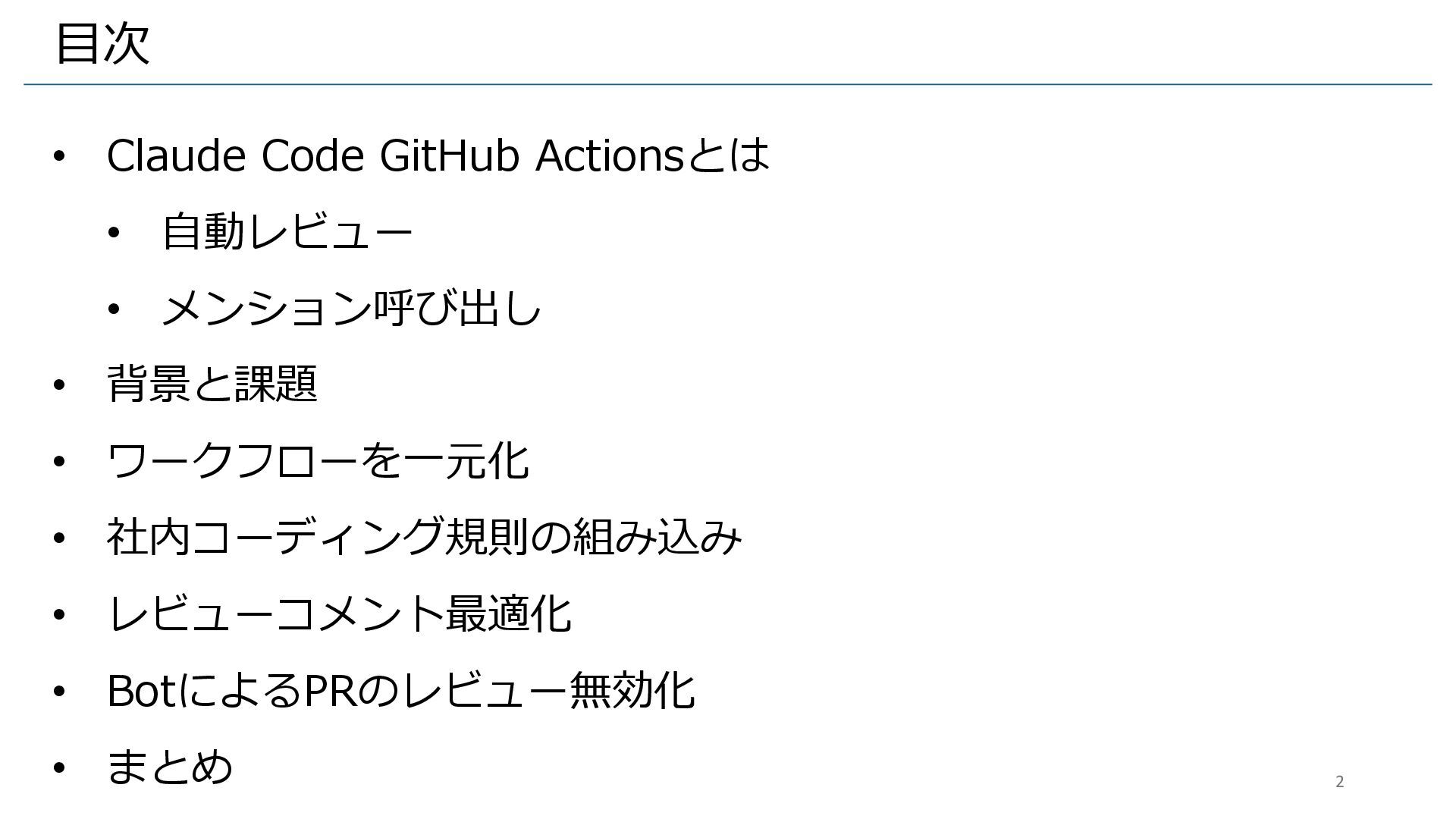 • 背景と課題 • ワークフローを一元化 • 社内コーディング規則の組み込み • レビューコメント最適化 • BotによるPRのレビュー無効化 • まとめ 2