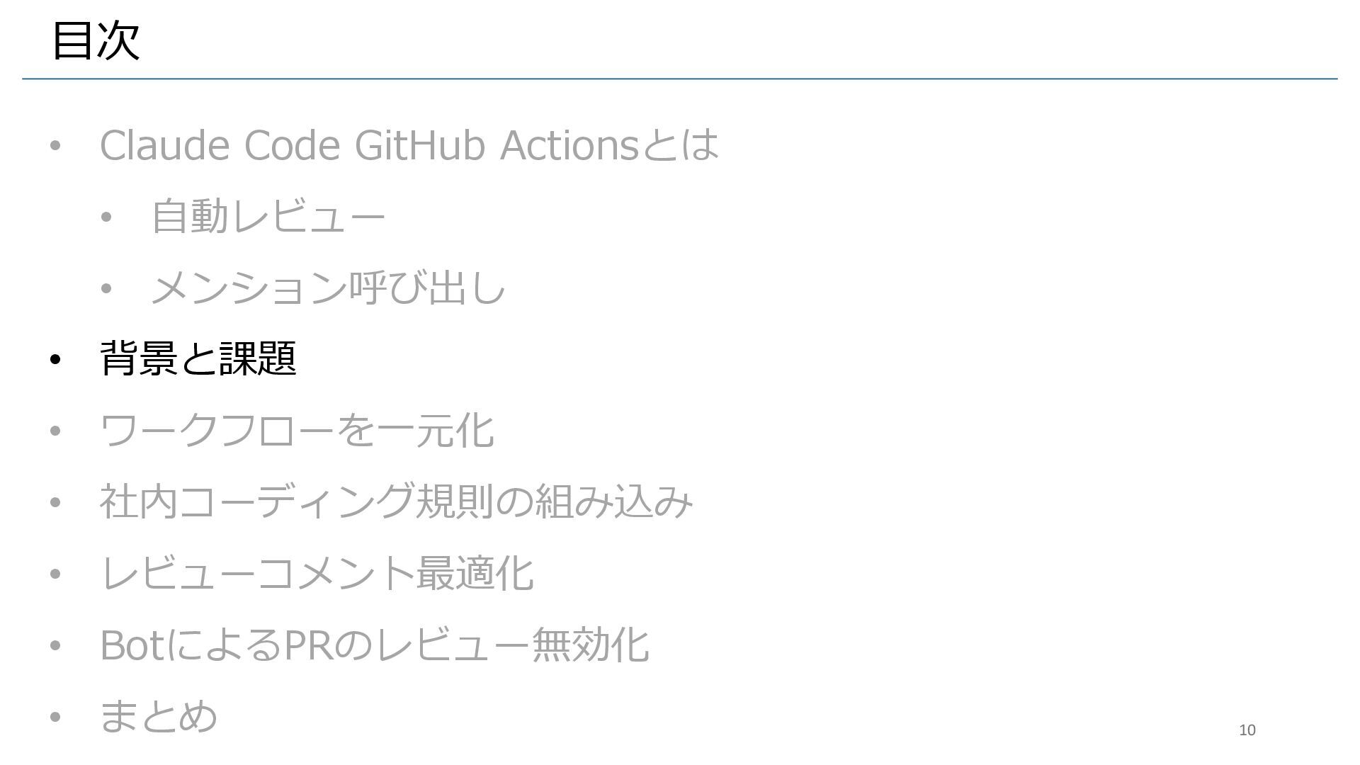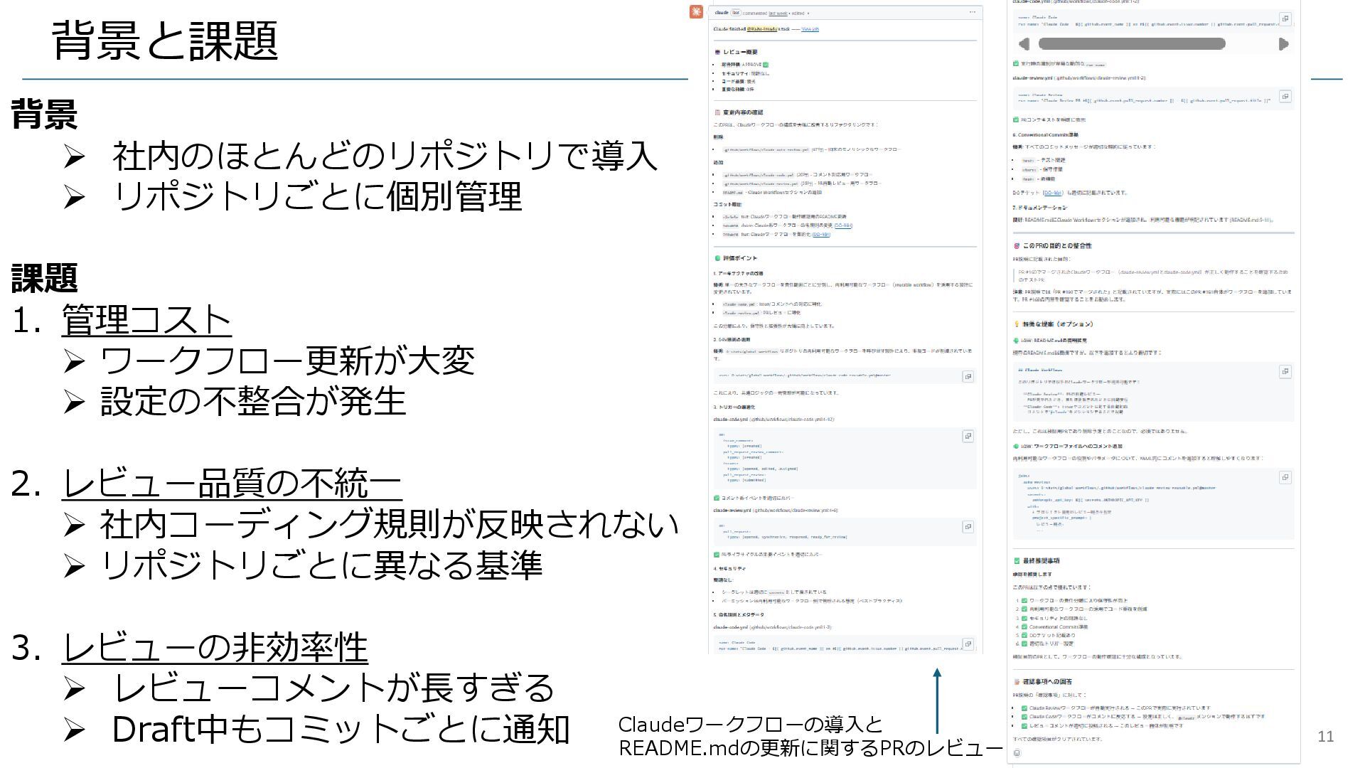 • 背景と課題 • ワークフローを一元化 • 社内コーディング規則の組み込み • レビューコメント最適化 • BotによるPRのレビュー無効化 • まとめ 10