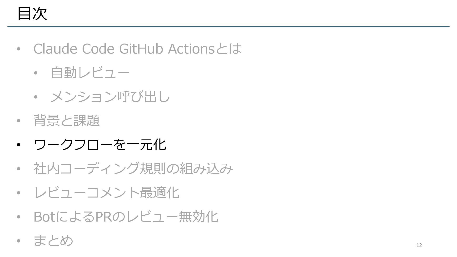ワークフロー更新が大変 ➢ 設定の不整合が発生 2. レビュー品質の不統一 ➢ 社内コーディング規則が反映されない ➢ リポジトリごとに異なる基準 3. レビューの非効率性 ➢ レビューコメントが長すぎる ➢ Draft中もコミットごとに通知 Claudeワークフローの導入と README.mdの更新に関するPRのレビュー 11