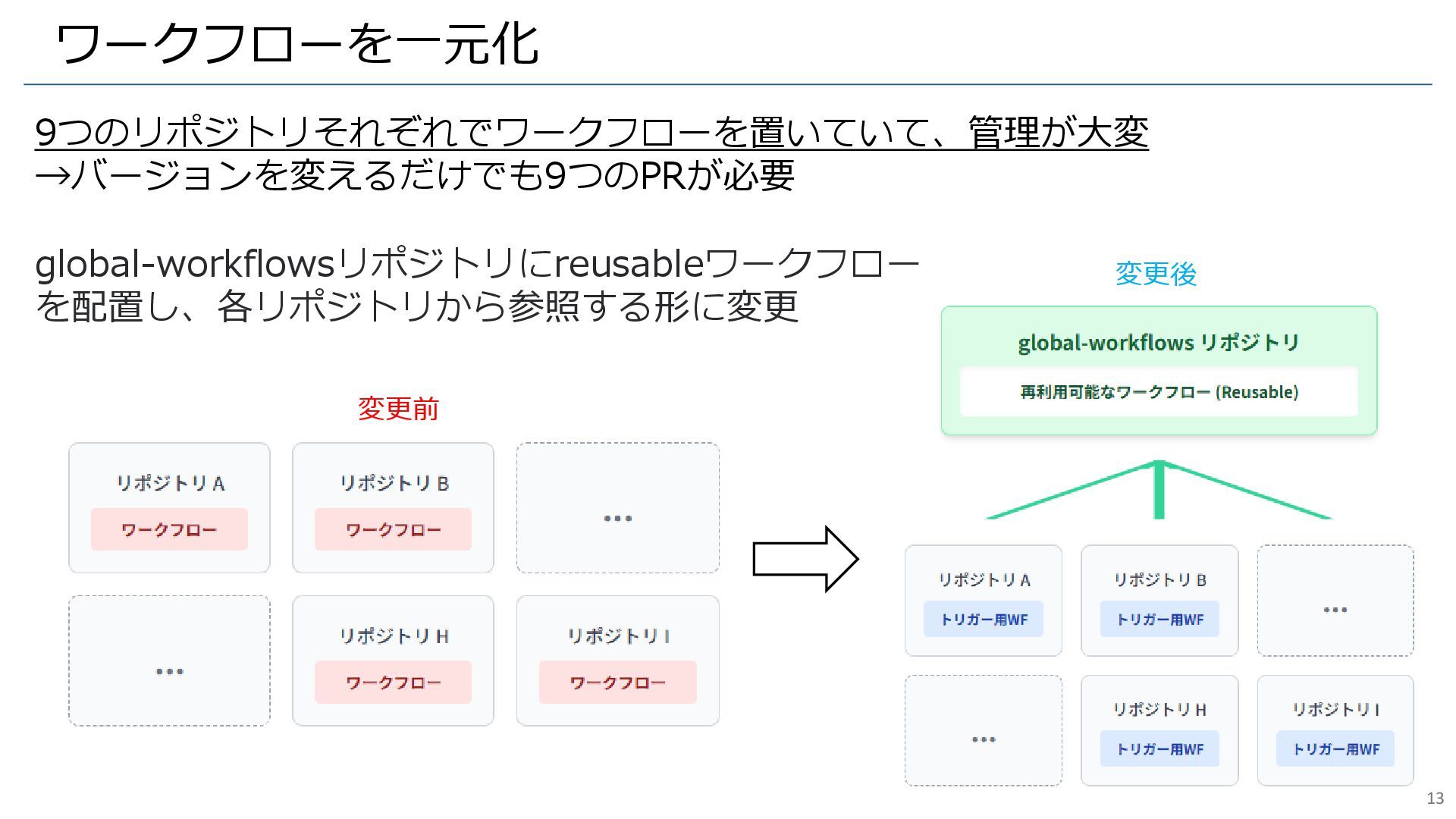 ワークフローを一元化 9つのリポジトリそれぞれでワークフローを置いていて、管理が大変 →バージョンを変えるだけでも9つのPRが必要 global-workflowsリポジトリにreusableワークフロー を配置し、各リポジトリから参照する形に変更 変更前 変更後 13